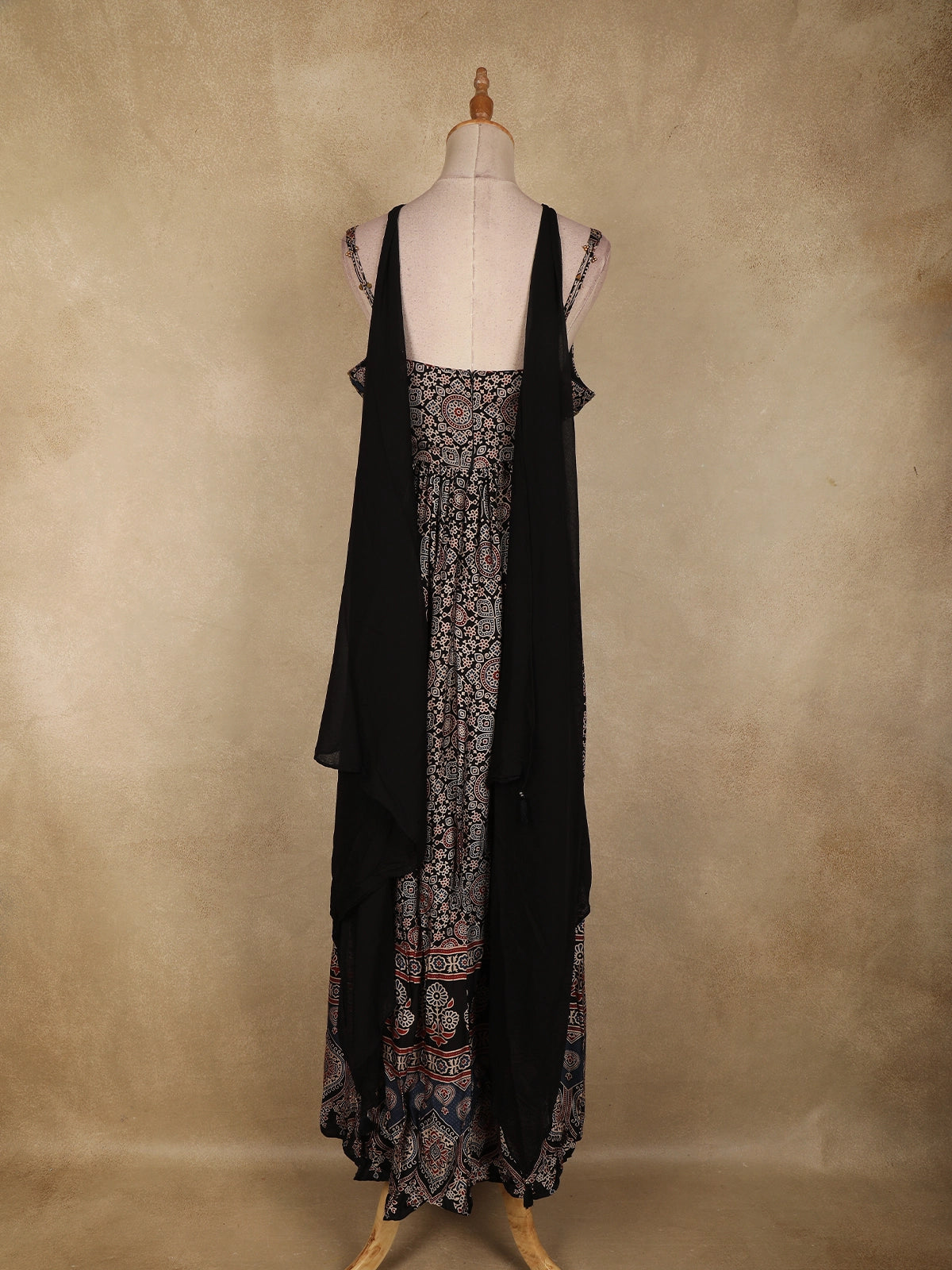 Elevate your ethnic wardrobe with this Black Ajrakh Print Design Crepe Palazzo Suit, a perfect blend of traditional artistry and contemporary elegance. Crafted in soft, flowy crepe fabric, this suit offers a lightweight feel with graceful movement, making it ideal for all-day comfort.