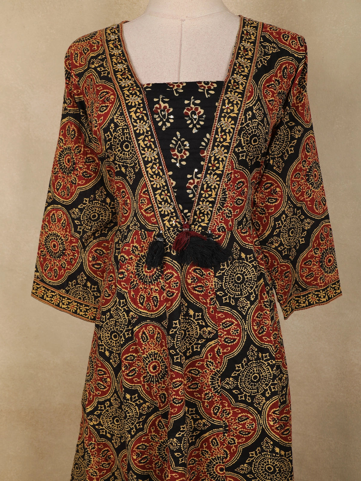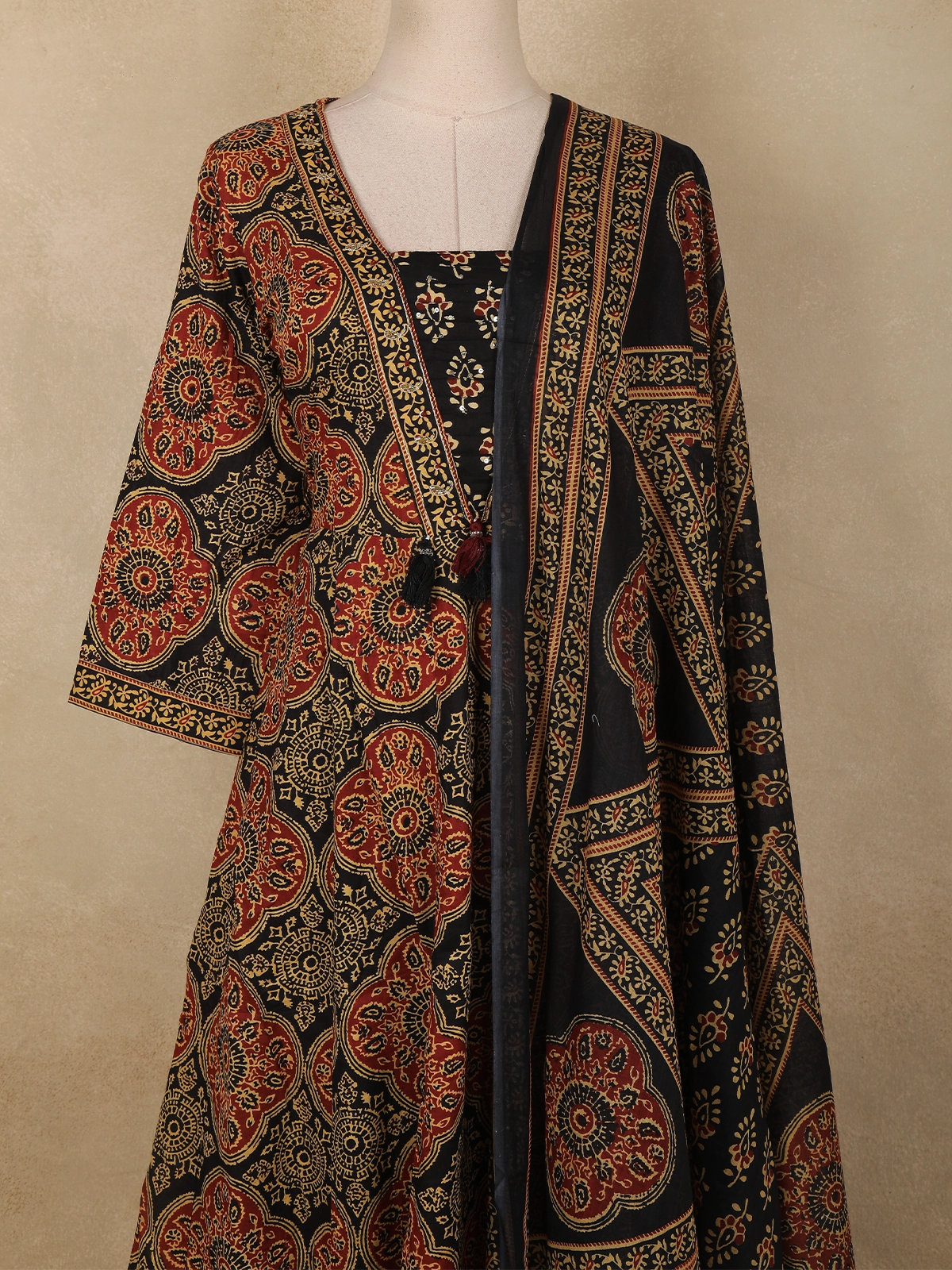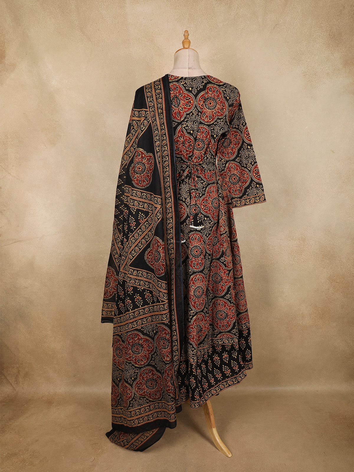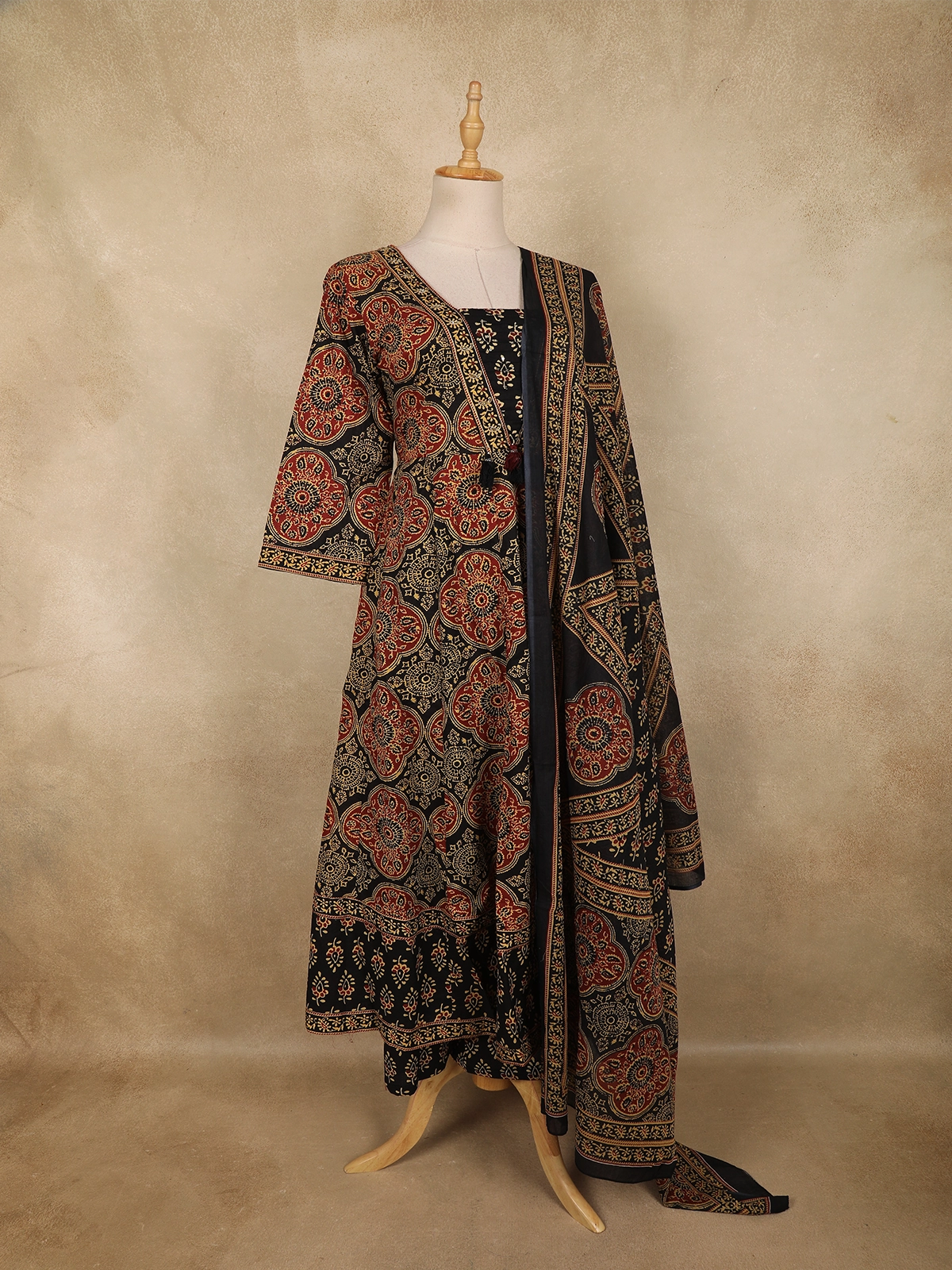 Designed in a graceful Anarkali silhouette, the kurta offers a beautiful flare accentuated by intricate circular and floral motifs spread evenly across the fabric. The neckline is highlighted with contrast printed borders and a subtle tie-up detail, adding a handcrafted touch. Complementing the kurta is a matching cotton salwar that ensures ease of movement and comfort throughout the day. The ensemble is completed with a coordinated Ajrakh printed dupatta, featuring bold panel-style patterns and ornate border detailing for a rich, cohesive finish.