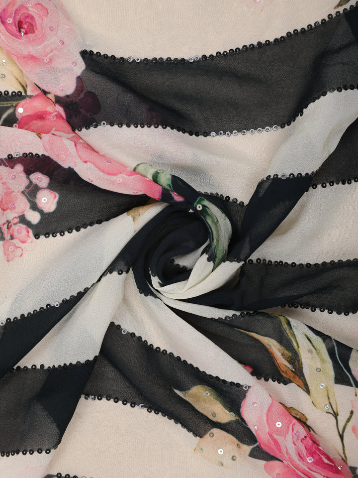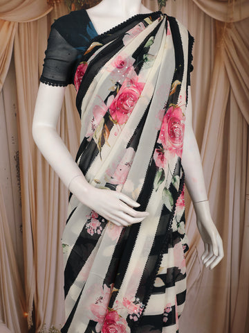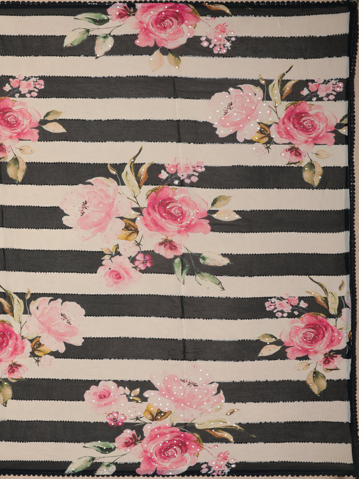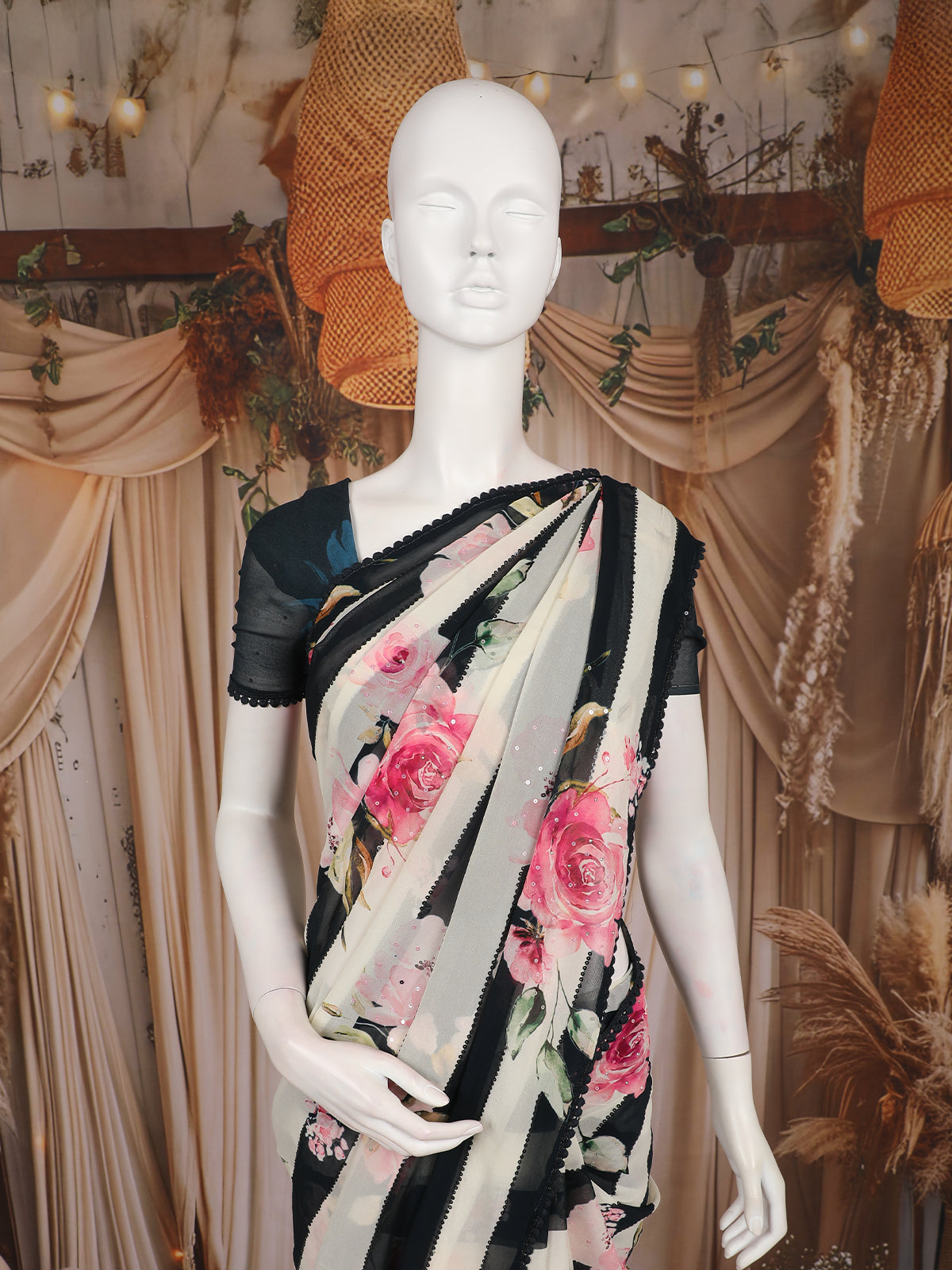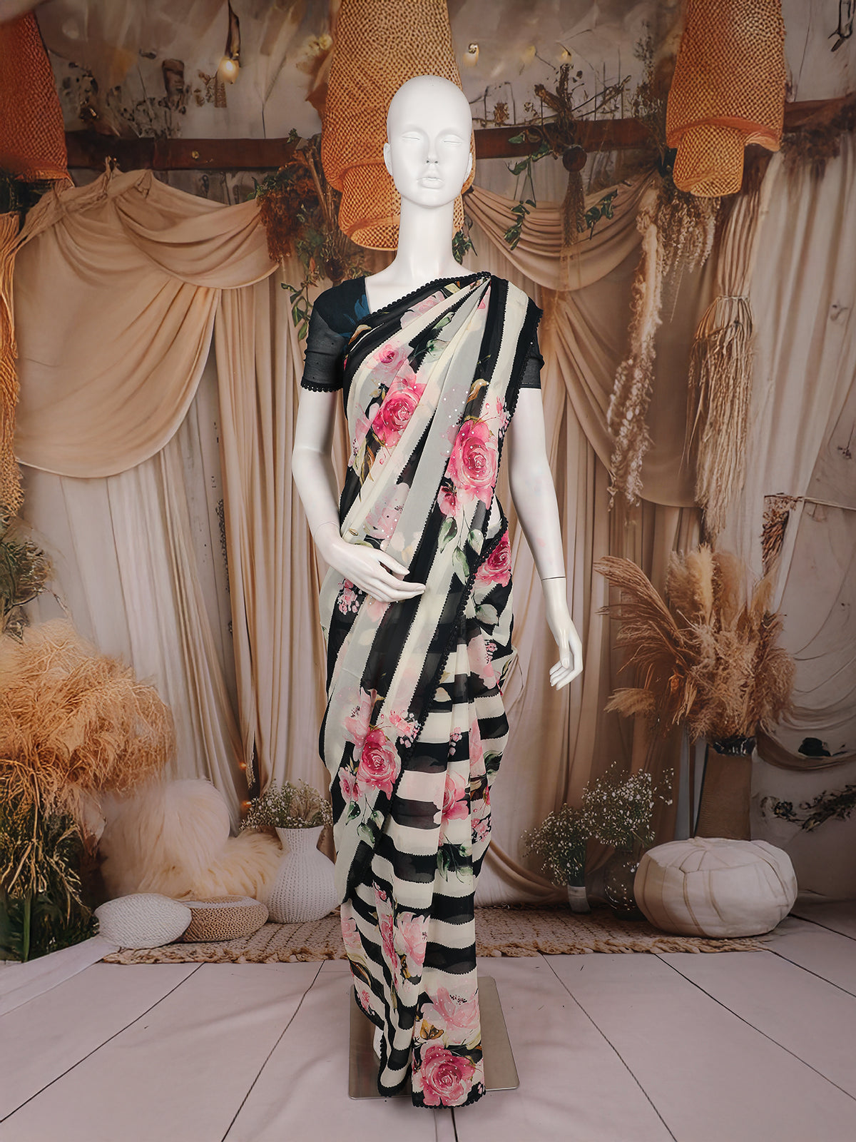 Black and Ivory Striped Floral Printed Chiffon Saree with Scallop Lace Edge Border