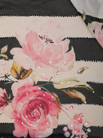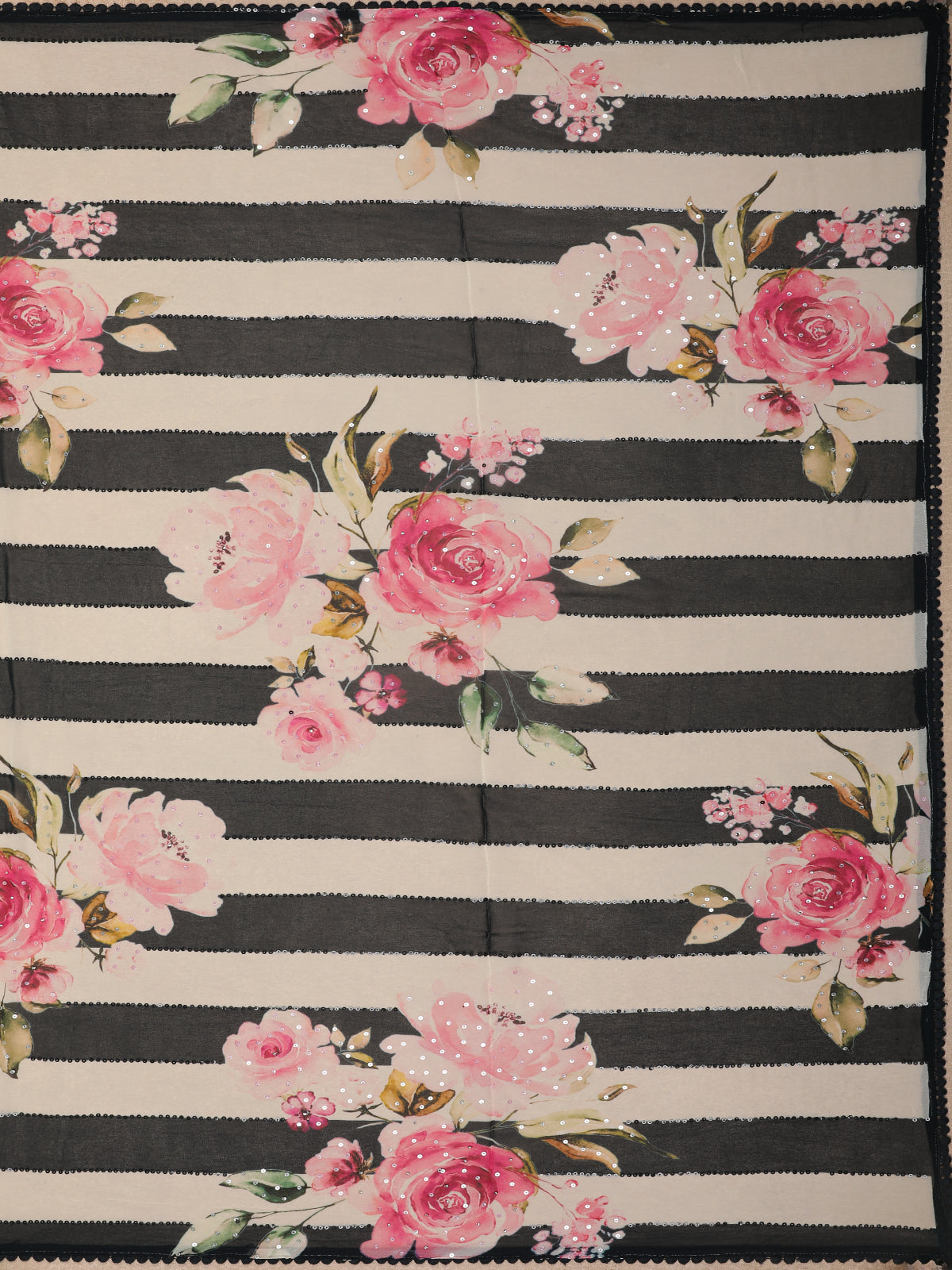 Elevate your everyday style with this chic Black and Ivory Striped Floral Printed Chiffon Saree, where modern design meets feminine elegance. The saree features a contemporary striped pattern in monochrome shades, beautifully complemented by soft pink rose floral motifs placed tastefully across the drape for a romantic touch.