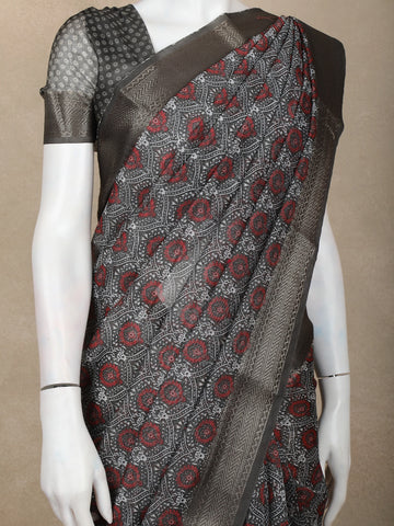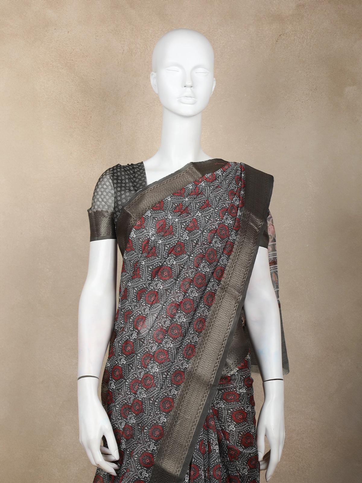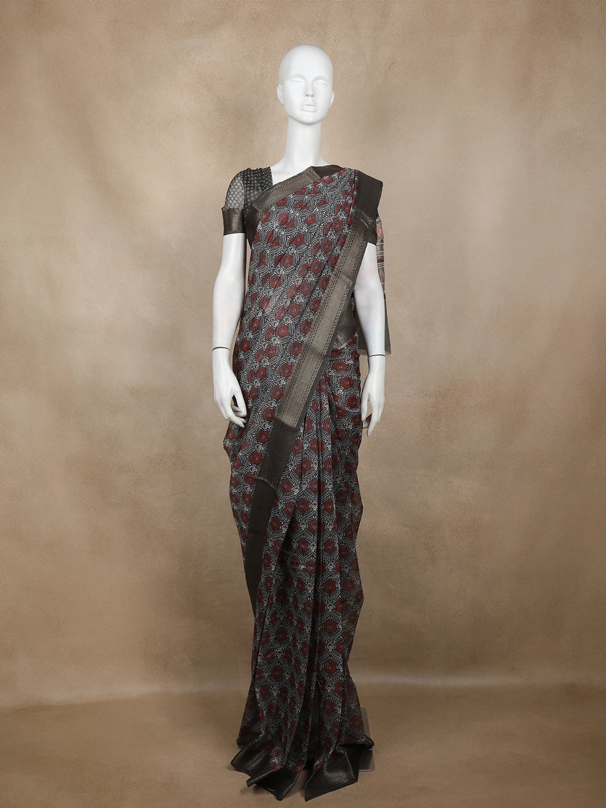 Elevate your traditional wardrobe with this elegant Black and Maroon Floral Woven Design Chanderi Cotton Saree, crafted to bring together comfort, grace, and timeless beauty. The saree features an intricate all-over floral woven pattern in maroon and grey tones, beautifully set against a deep black base, giving it a luxurious and refined appeal. Made from lightweight Chanderi cotton, the fabric offers a subtle sheen and an effortless drape, making it comfortable for all-day wear while maintaining a polished, festive look.