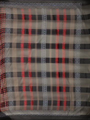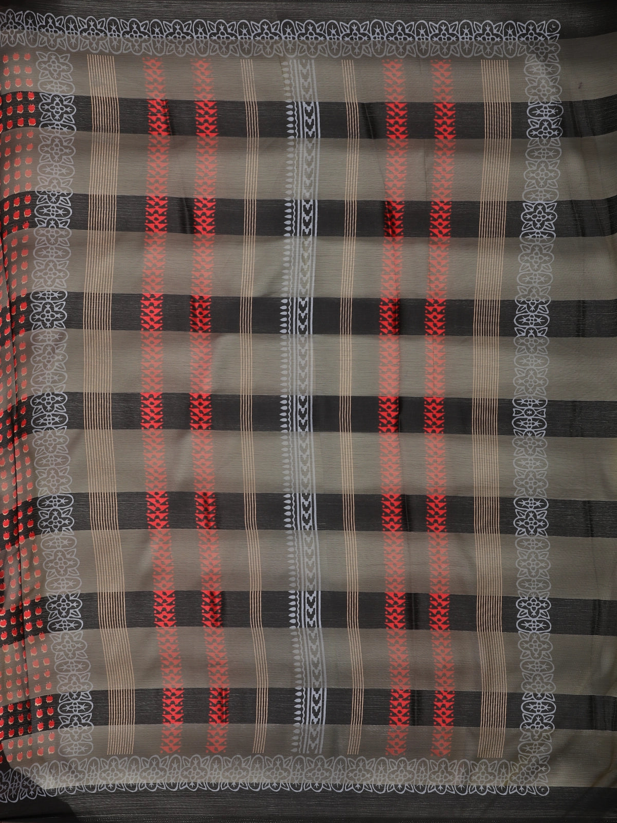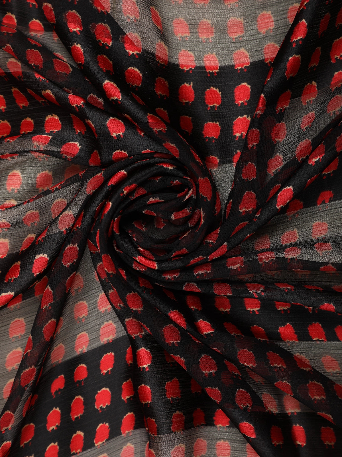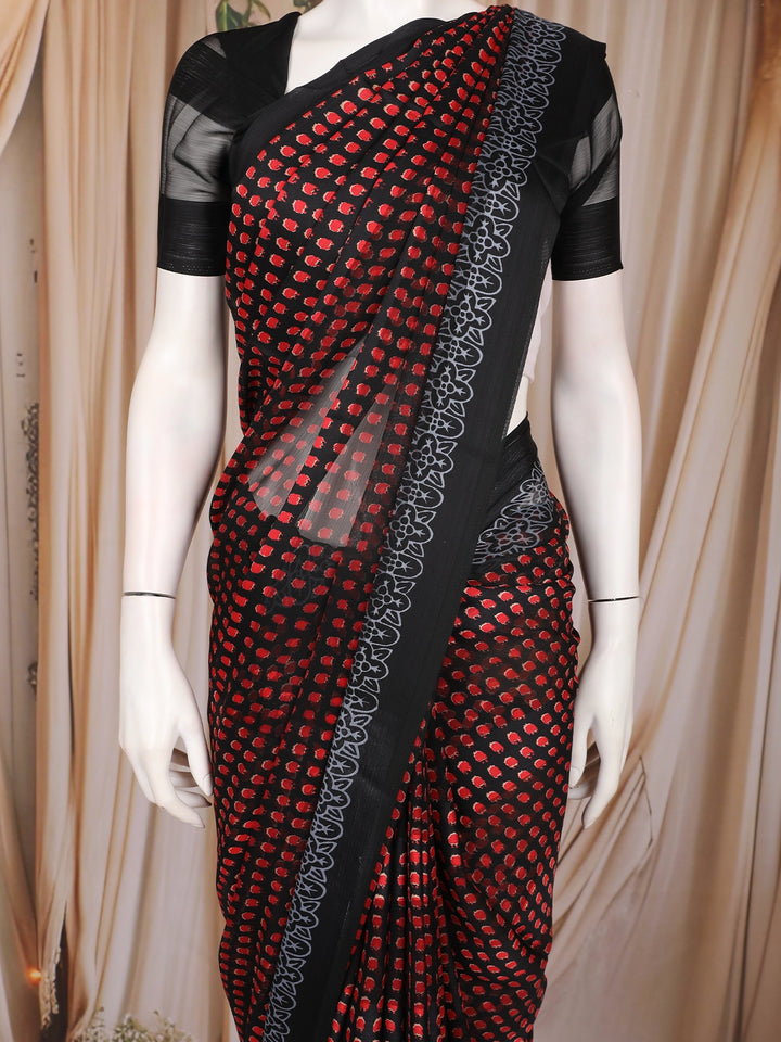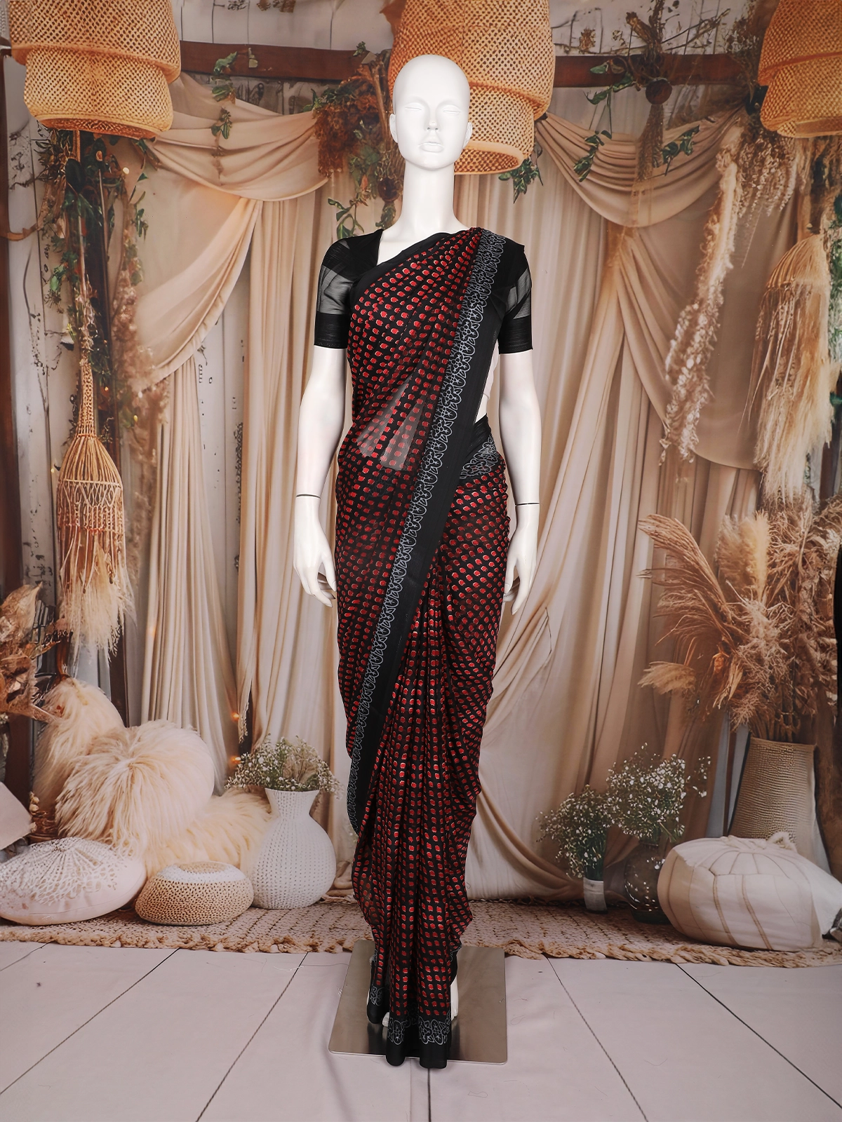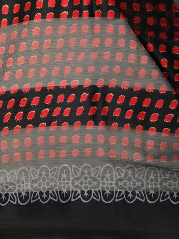 Black and Red Butta Printed Design Chiffon Saree with Contrast Black Border
