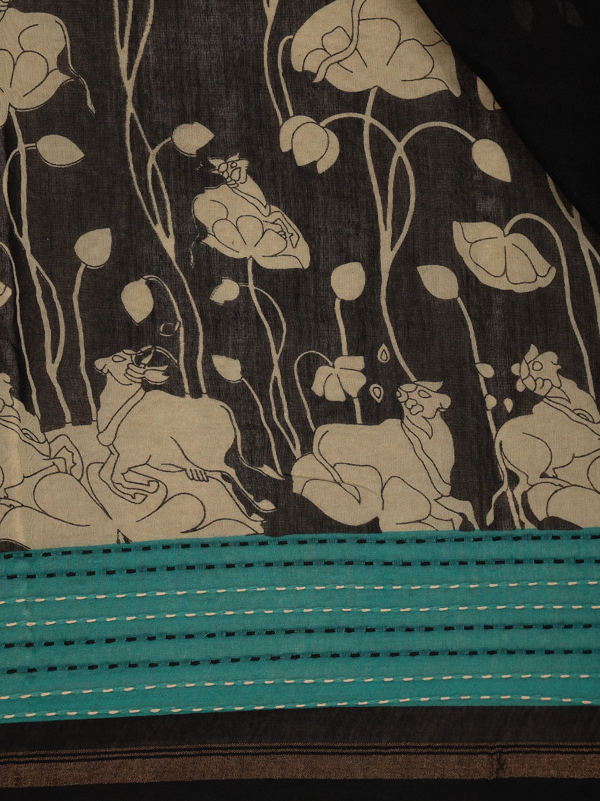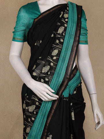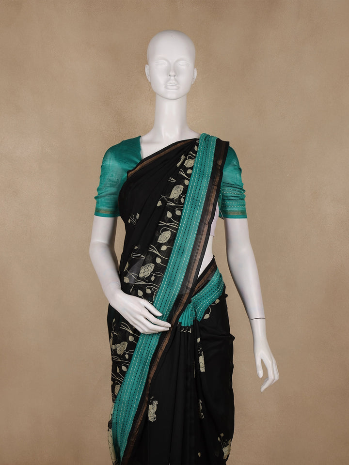 Black And Teal Green Floral Printed Chandheri Cotton Saree
