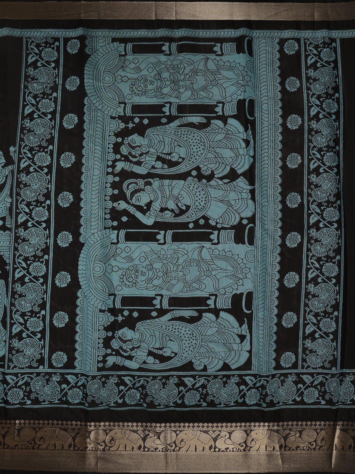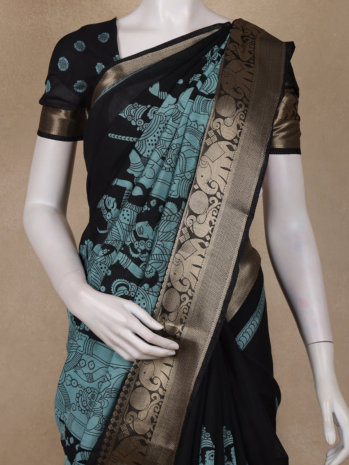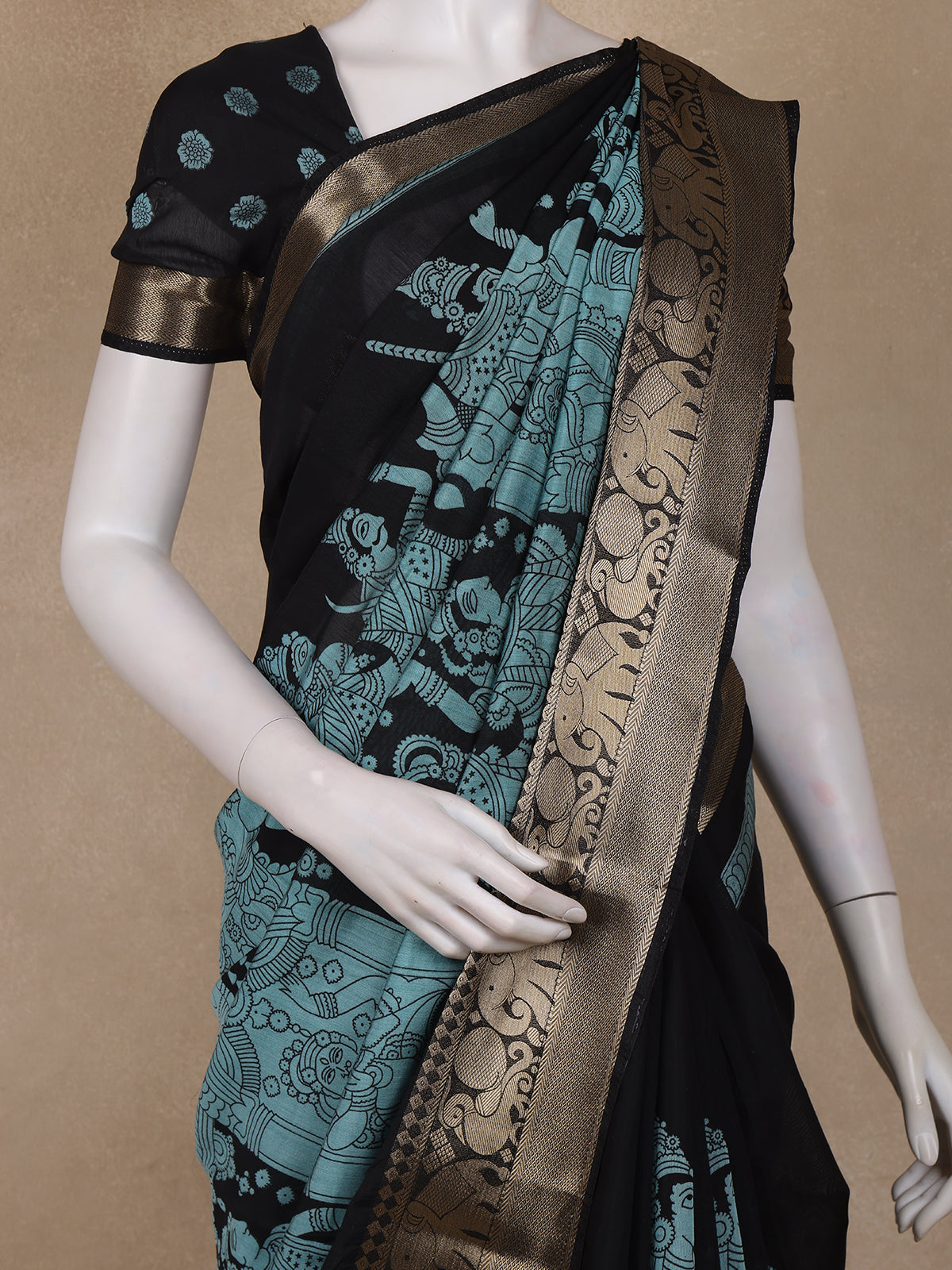 Black and Teal Kalamkari Printed Design Chanderi Cotton Saree with Contrast Zari Border