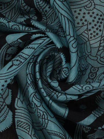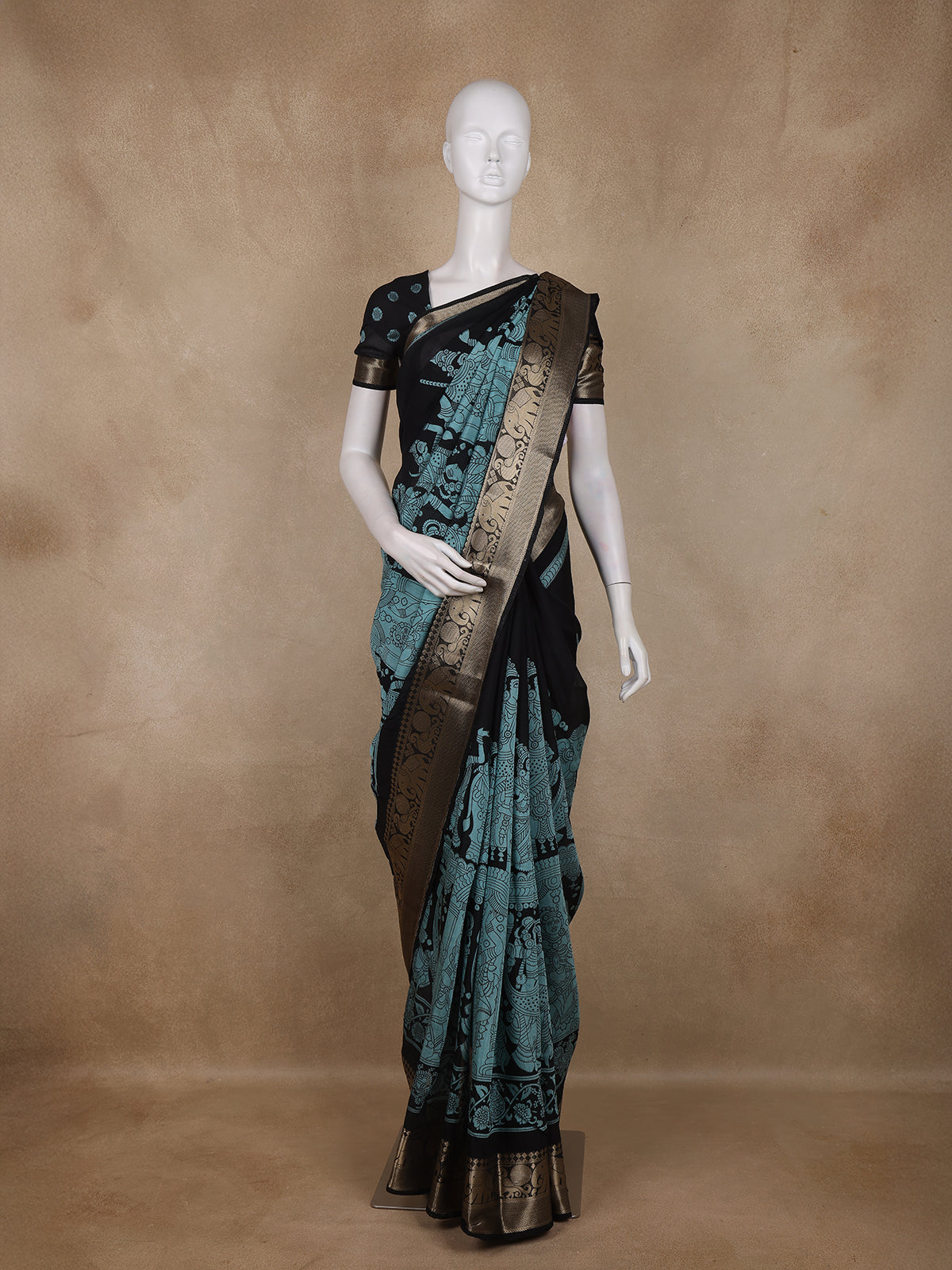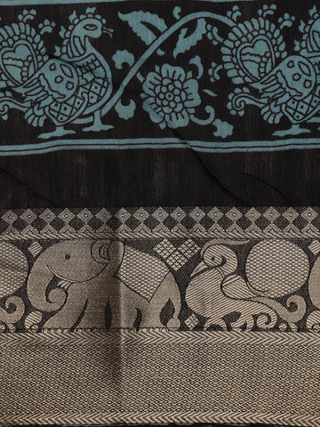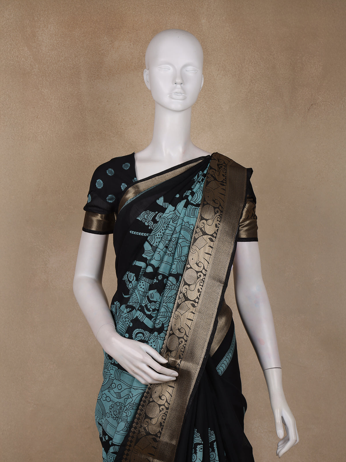 Black and Teal Kalamkari Printed Design Chanderi Cotton Saree with Contrast Zari Border