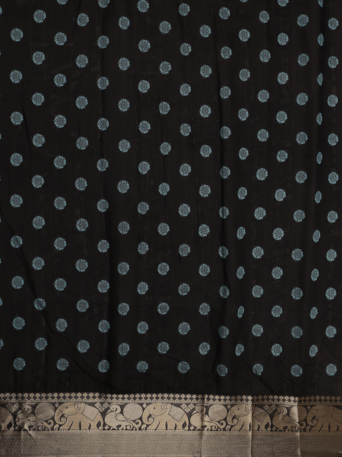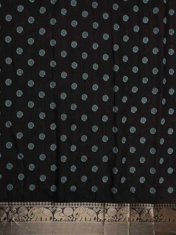 This Black and Teal Chanderi Cotton Saree brings together heritage art and timeless elegance. The saree features Kalamkari-inspired motifs spread gracefully across the body, highlighting elements of tradition through intricate temple figures and floral patterns. The rich contrast of teal motifs over a deep black base creates a striking visual harmony.