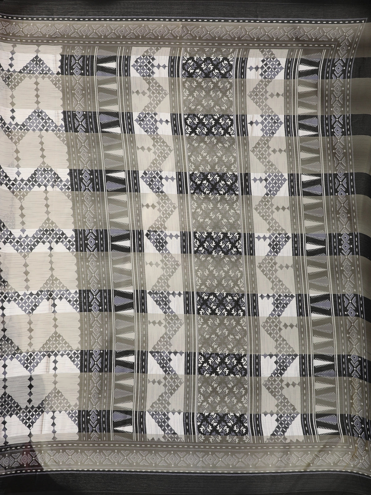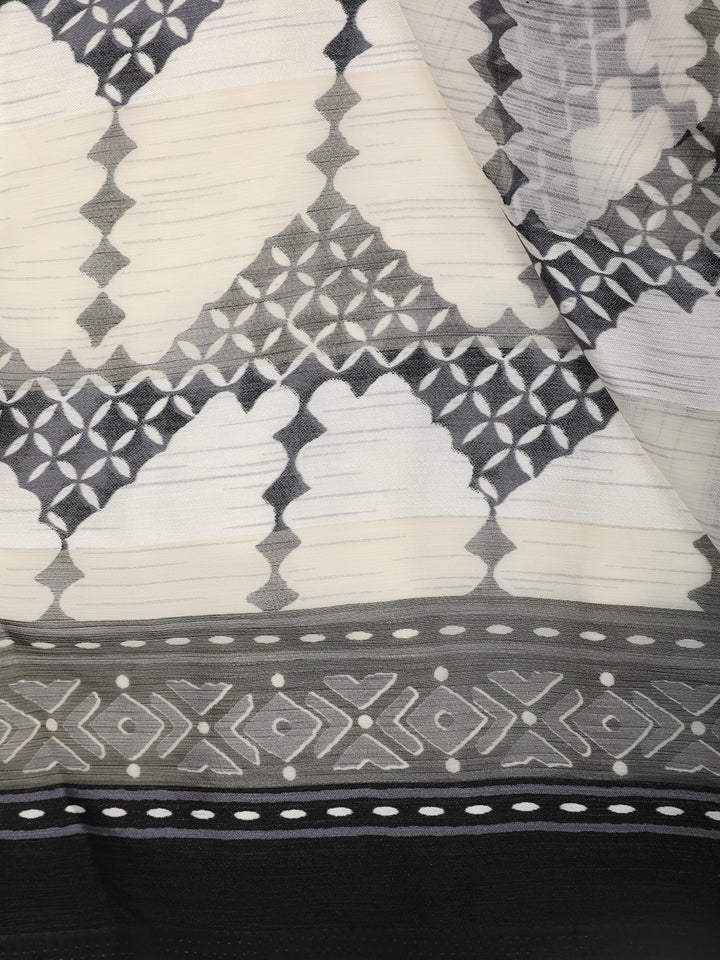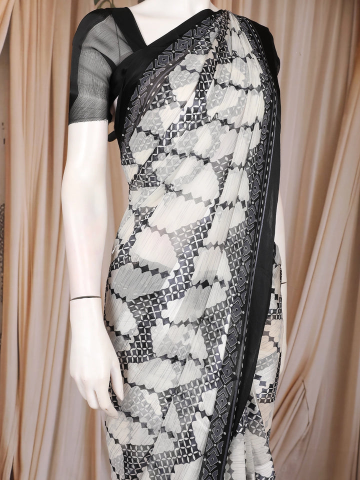 Black and White Abstract Printed Design Chiffon Saree with Contrast Black Pattern Border