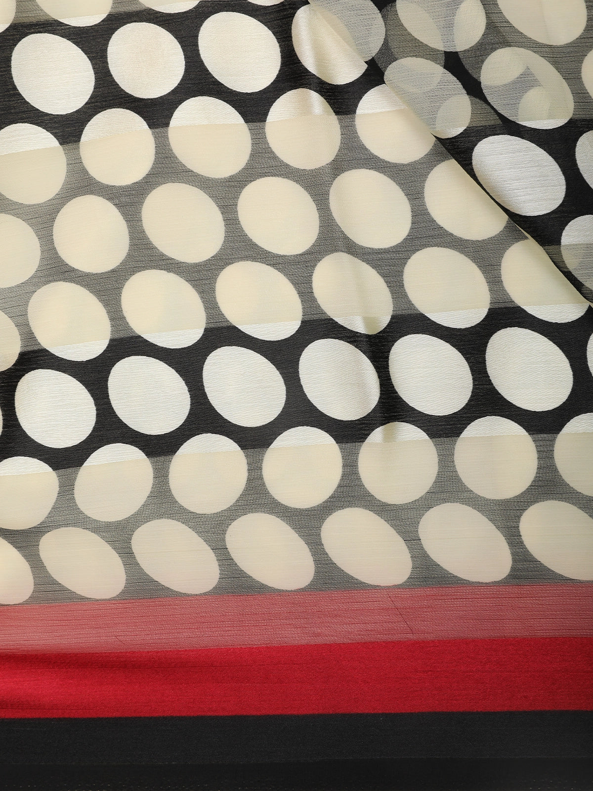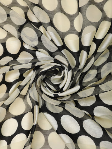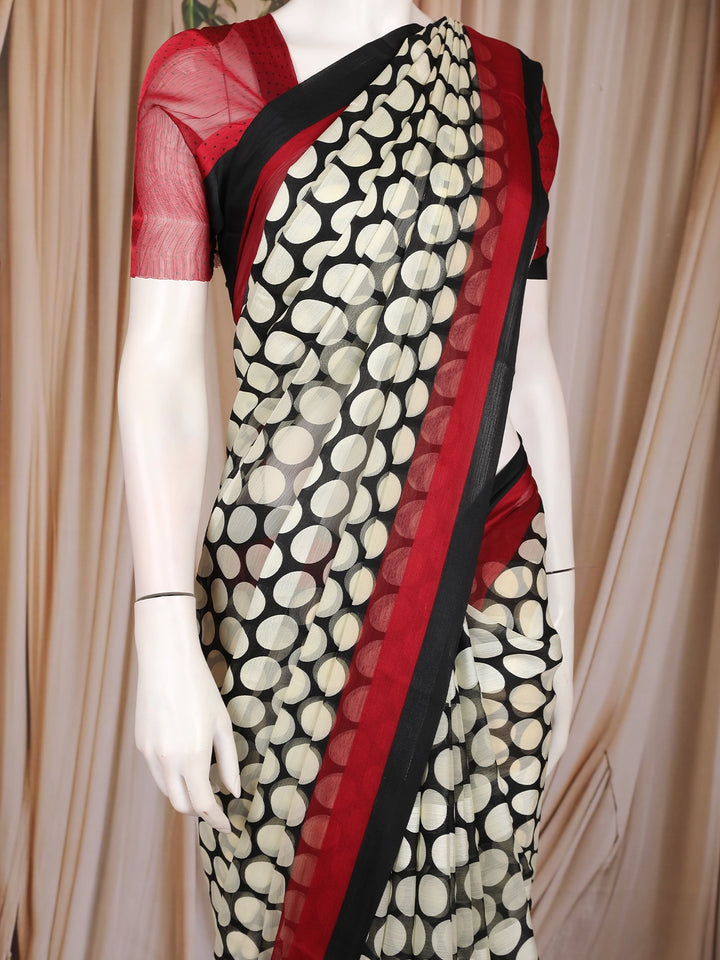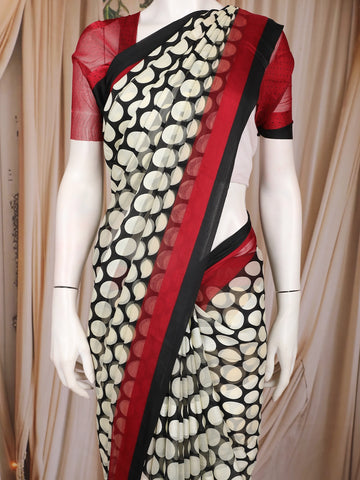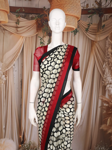 This black and white chiffon saree stands out with a bold and artistic appeal. The saree features an abstract circular printed pattern throughout, giving it a fashionable and contemporary look that instantly attracts attention. The lightweight chiffon fabric flows beautifully, offering a soft and elegant drape that feels comfortable and easy to style for all-day wear.