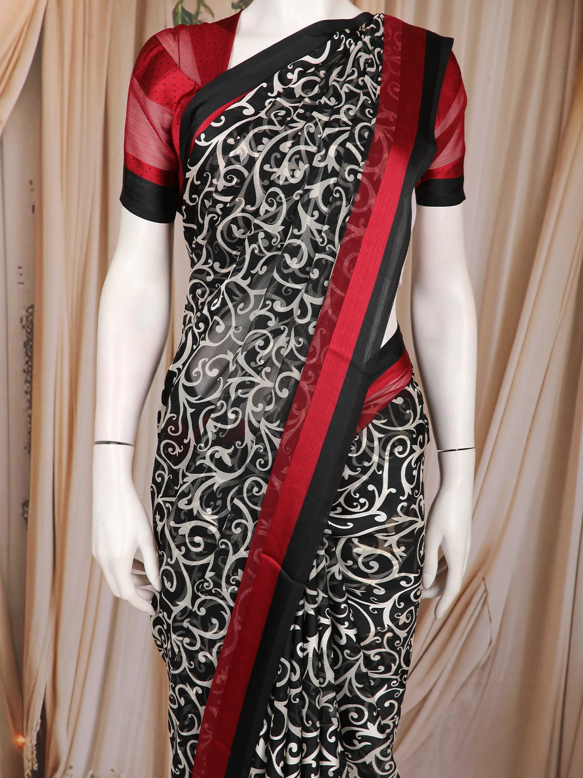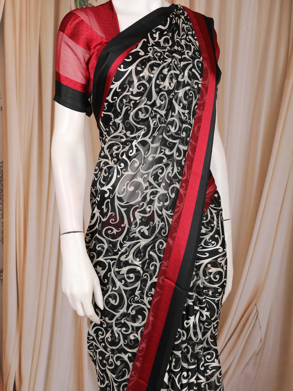 This elegant chiffon saree blends a timeless black and white floral print with a striking contrast maroon border, creating a look that is effortlessly graceful. The soft and lightweight chiffon fabric drapes beautifully, giving a flattering fall that suits every body type. The floral pattern adds a touch of femininity while the maroon border enhances the overall sophistication of the saree, making it stand out with subtle style.