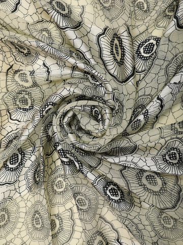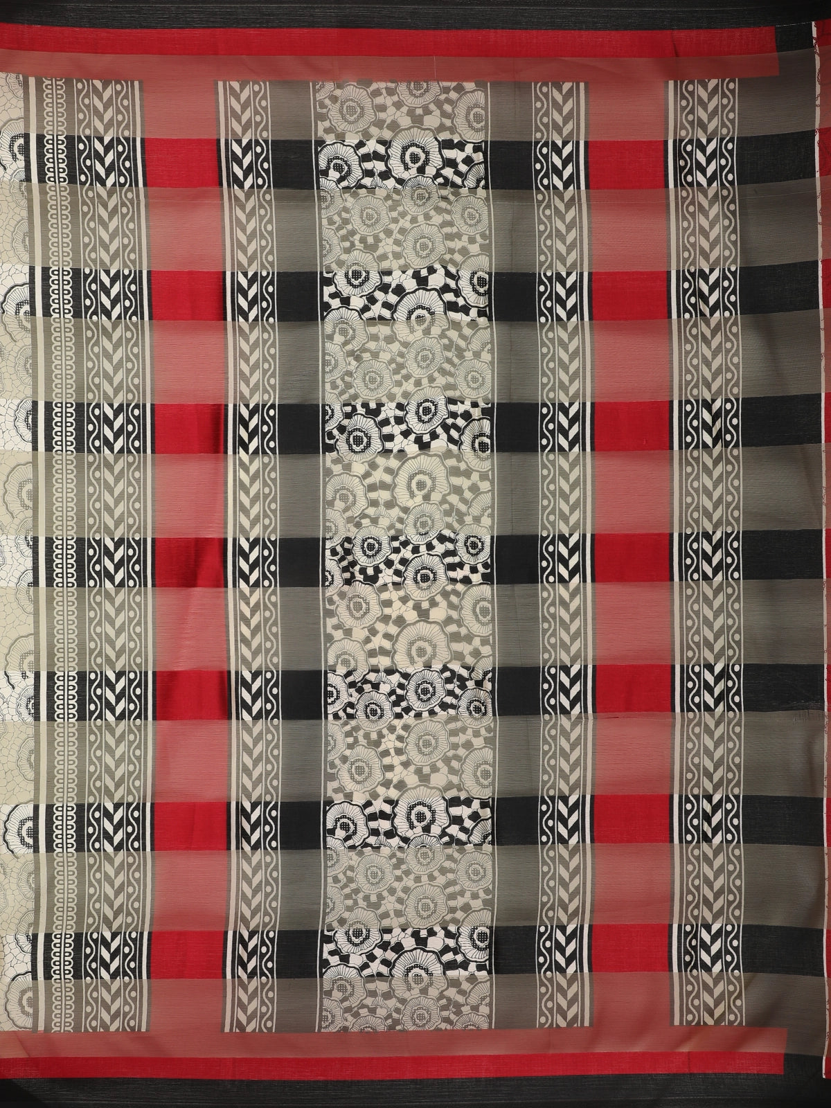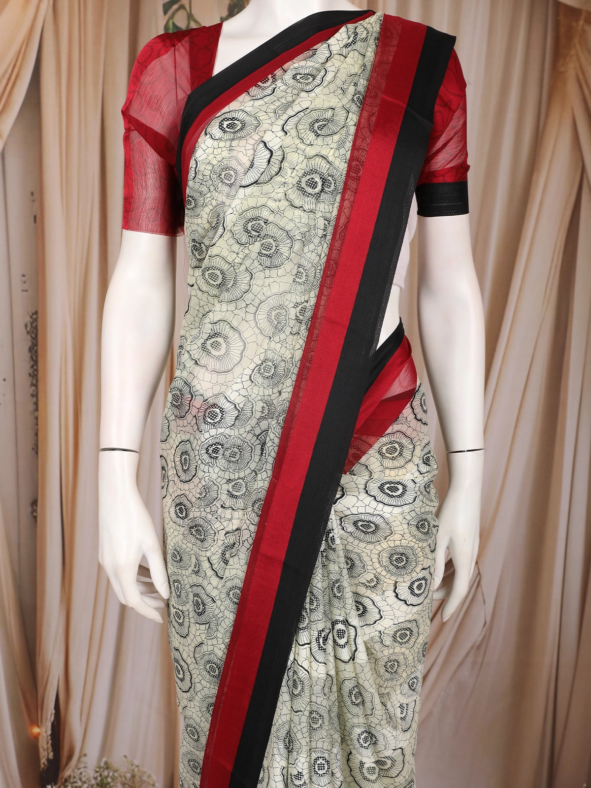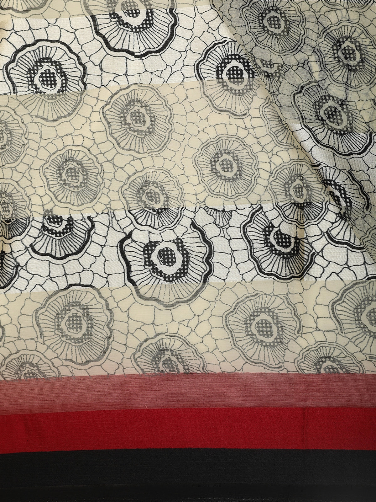 Black and White Floral Printed Design Chiffon Saree with Contrast Red Border