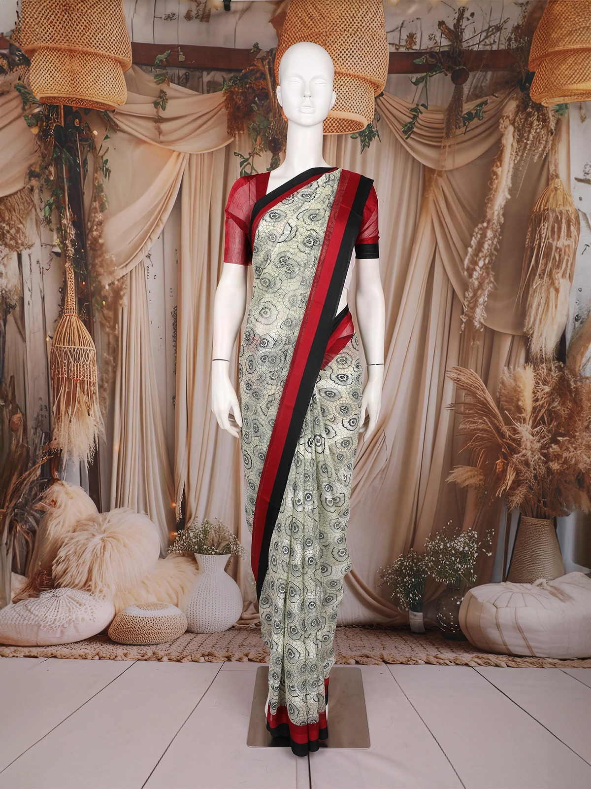 Step into effortless elegance with this Black and White Floral Printed Chiffon Saree, beautifully framed with a bold contrast Red Border. The lightweight chiffon drapes gracefully, making it perfect for all-day comfort and easy movement. The intricate floral print adds a touch of artistic charm, while the striking red border brings structure and a refined pop of color to the overall look. Paired with a matching blouse fabric, this saree balances classic appeal with modern minimalism. Ideal for office wear, casual gatherings, and everyday styling, it lets you look graceful with minimal effort. A timeless choice for those who love subtle prints with a statement finishing touch.
