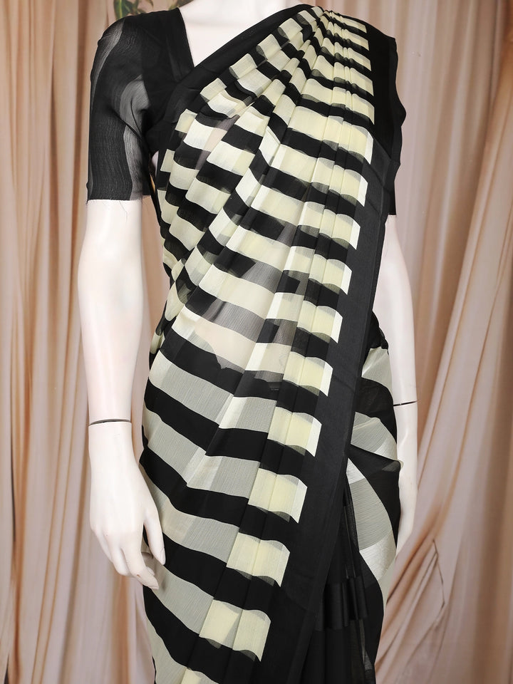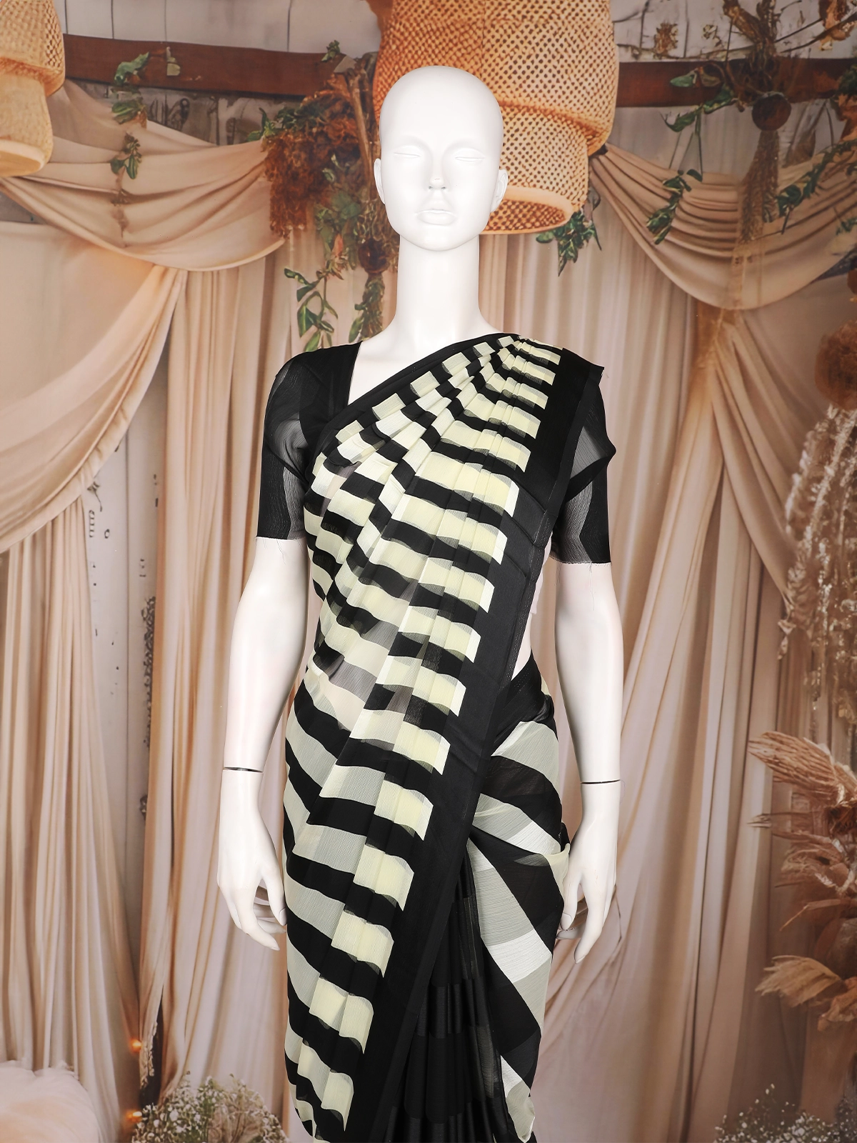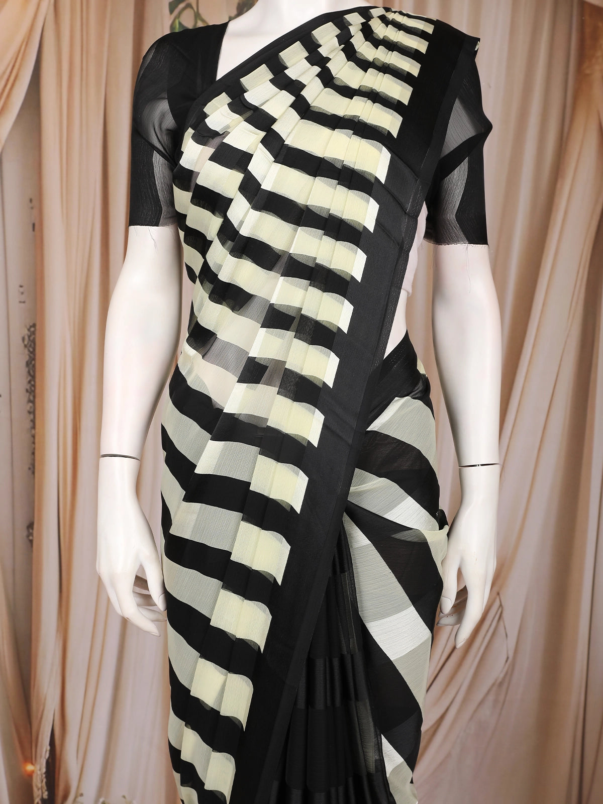 Black and White Striped Printed Design Chiffon Saree with Contrast Border