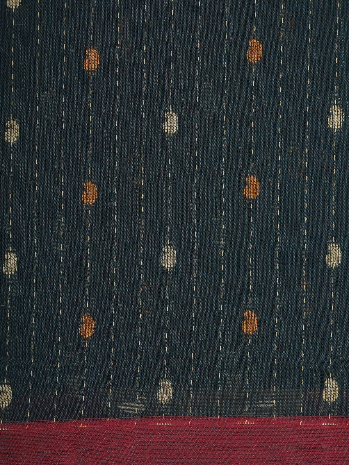 Embrace graceful everyday elegance with this Black Butta Design Cotton Saree, crafted to blend comfort with traditional charm. The deep dark tone (close to bottle green) forms a rich base, adorned with finely woven vertical stripes that give the saree a sleek and elongated appeal. Scattered mustard and beige thread buttas add a delightful contrast, beautifully enhancing the overall simplicity of its design.