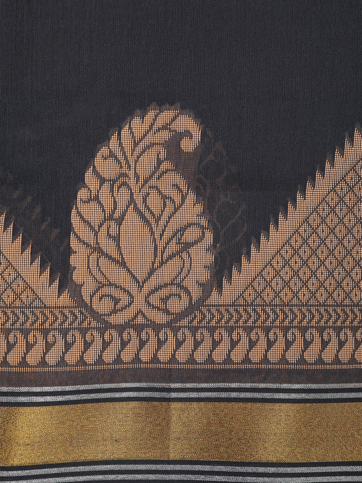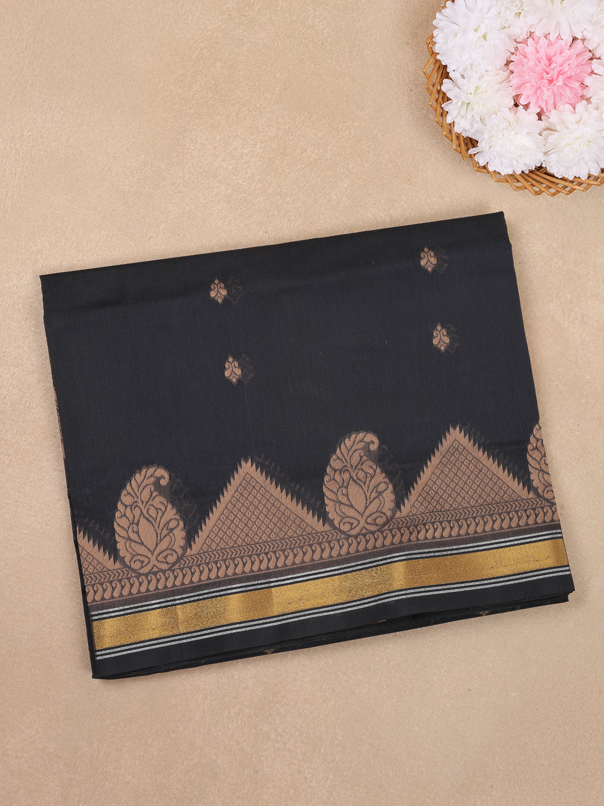 This Black Paisley and Geometric Woven Cotton Saree captures the essence of understated elegance through its refined craftsmanship and timeless charm. The saree features intricately woven paisley motifs along the border, accentuated by geometric detailing and a striking gold zari border that lends a regal finish. The minimal butta motifs across the body add a subtle decorative touch, enhancing its traditional appeal.