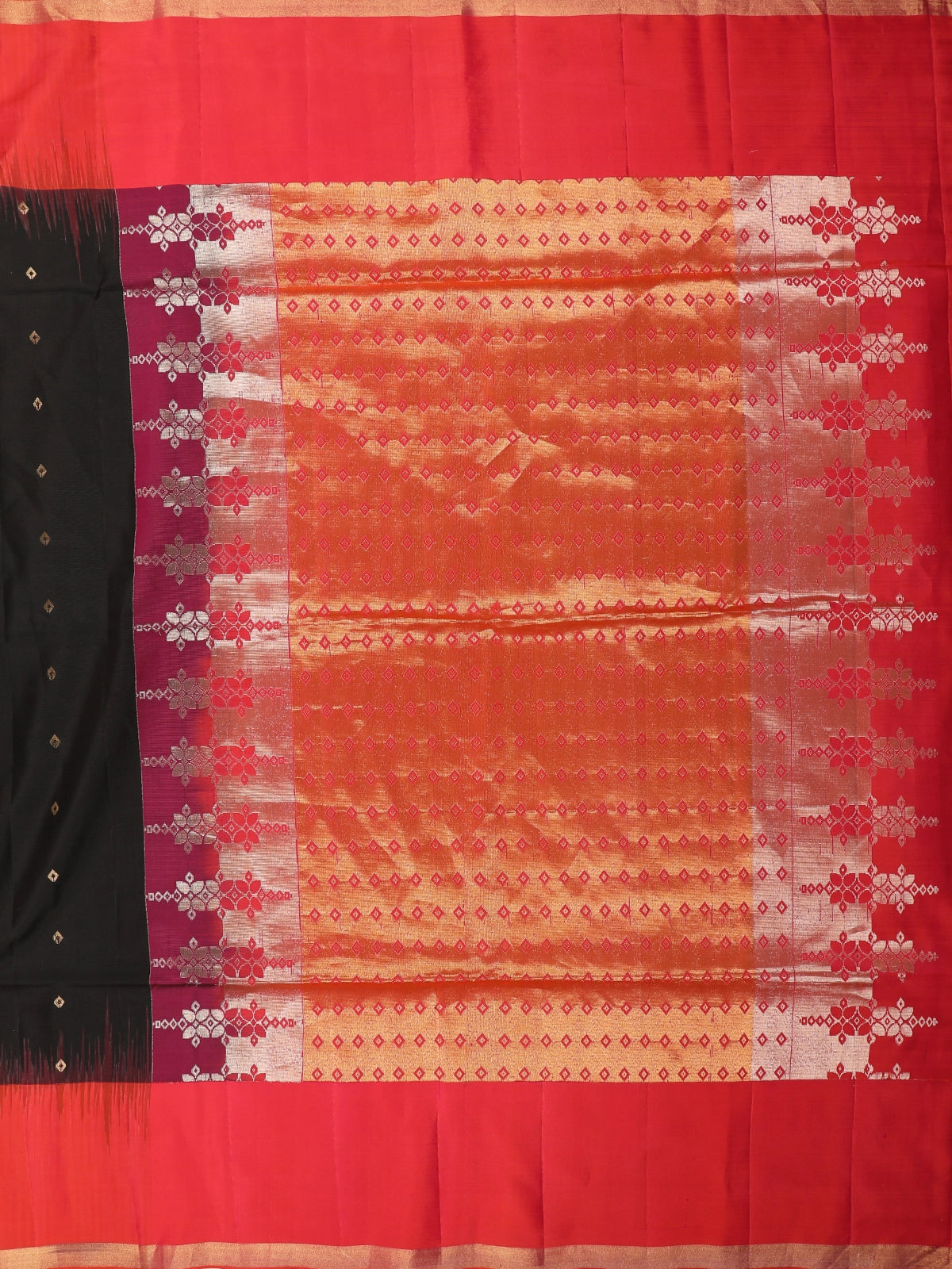 Adding a bold, festive contrast is the rich red zari border, exquisitely woven with golden highlights that frame the saree with regal finesse. The pallu continues this vibrant interplay of red and gold, elevating the ensemble with a heritage-inspired finish. Paired with a matching red blouse featuring zari detailing, this saree makes a powerful impression of elegance, tradition, and modern style.