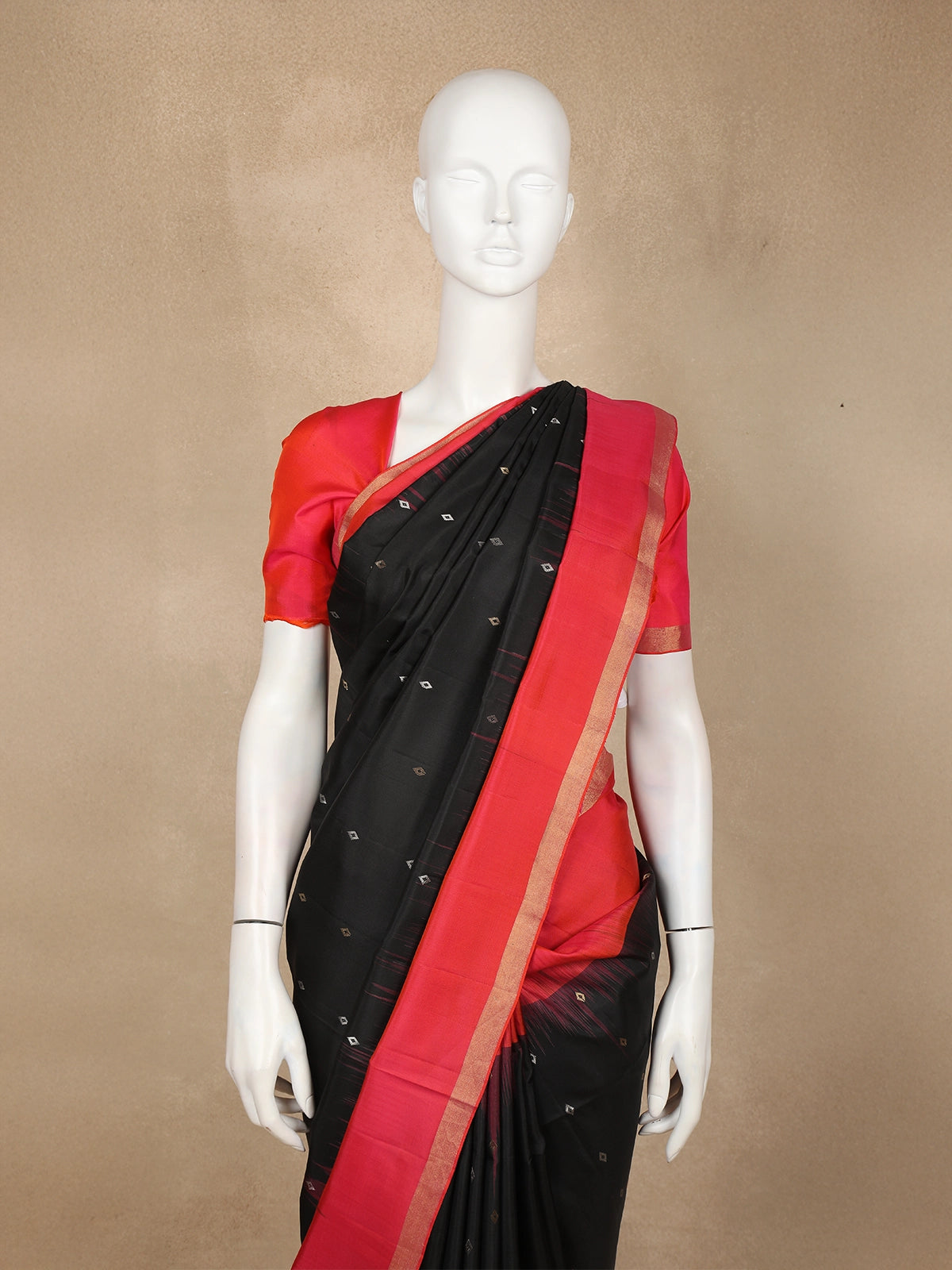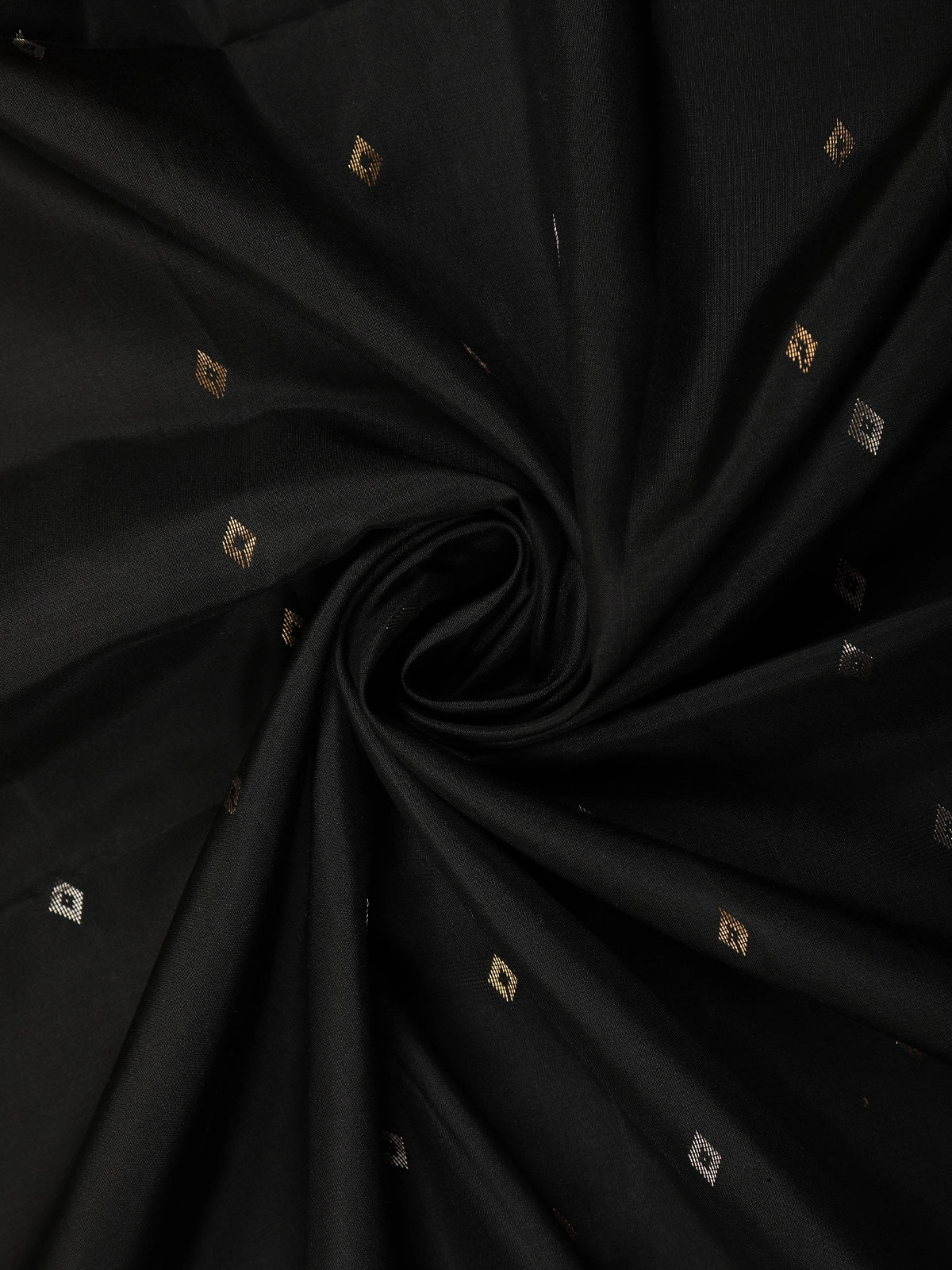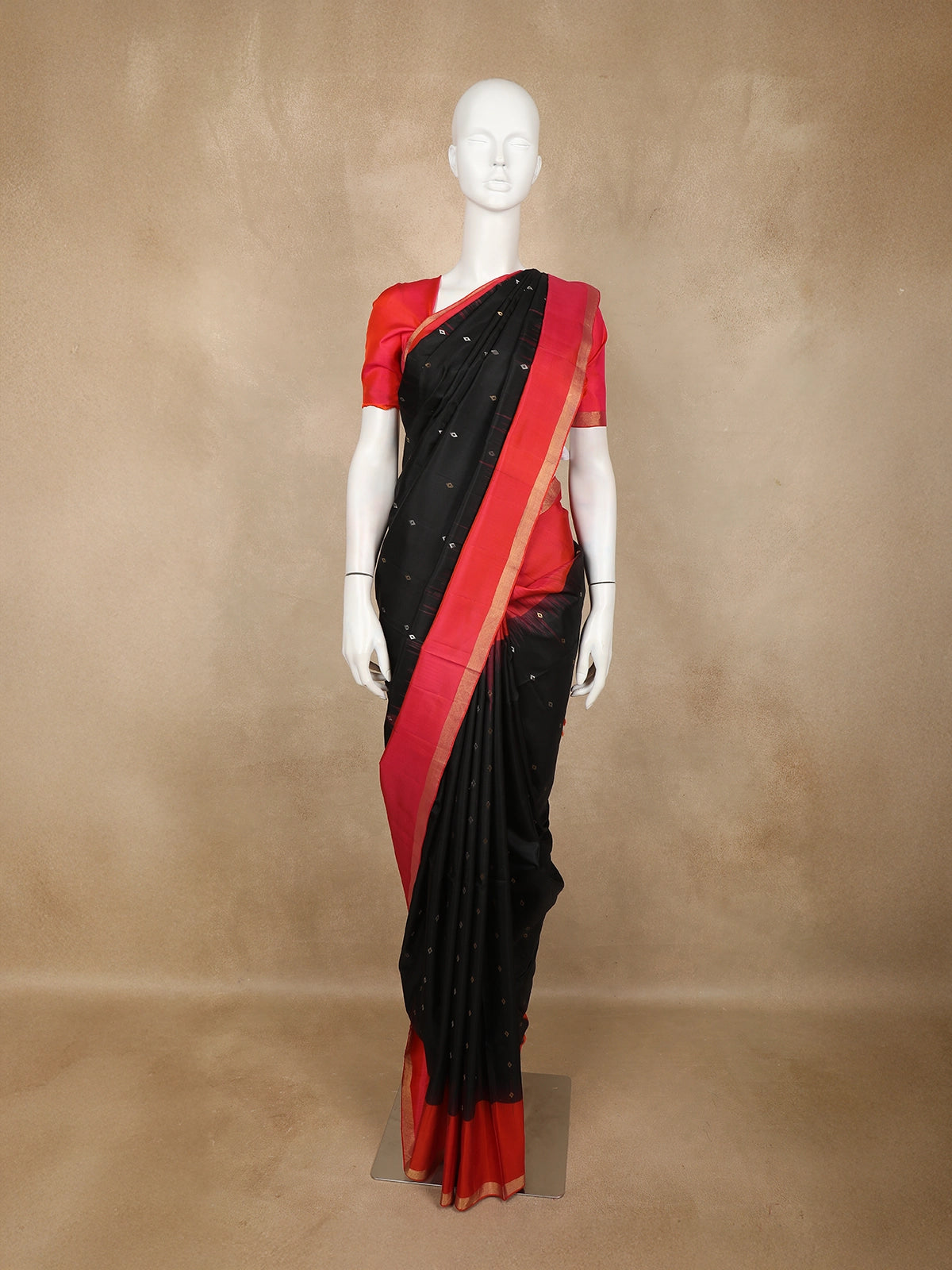 The body features delicate gold butta woven motifs, adding a subtle shimmer against the deep black base. These motifs create a refined traditional look while maintaining a minimal aesthetic, making the saree perfect for both grand events and intimate celebrations.