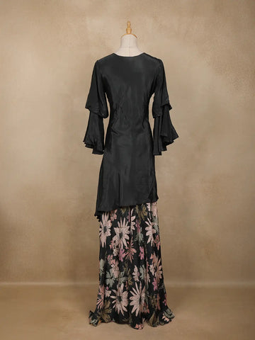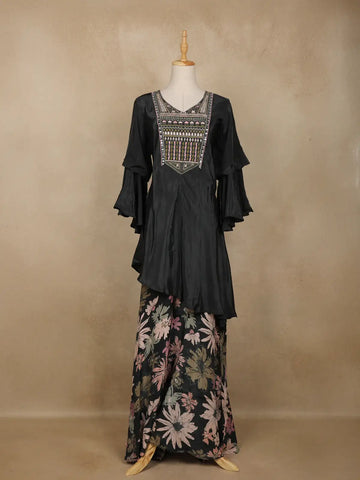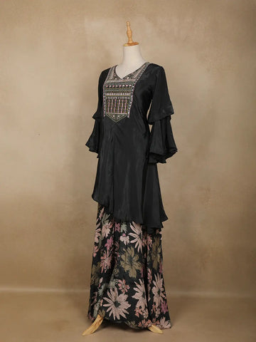 Step into effortless elegance with this Black Crepe Palazzo Suit, a striking fusion of modern chic and traditional grace. The smooth crepe fabric drapes beautifully, offering both comfort and sophistication, while the timeless black hue makes it an endlessly versatile festive choice.