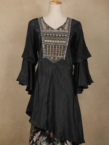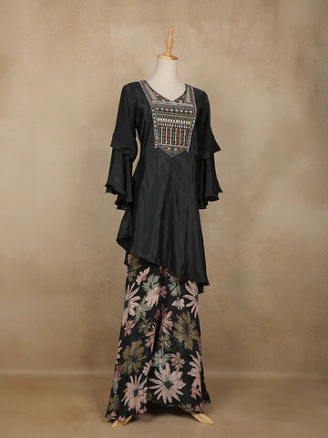 The kurta is styled with an embellished design, showcasing intricate embroidery along the yoke that elevates its festive appeal. The layered ruffle sleeves and asymmetrical hemline add a contemporary twist, creating a silhouette that is both stylish and flattering. Paired with wide-legged palazzo pants, the outfit combines ease of movement with an elegant flair, making it a standout for celebratory occasions.