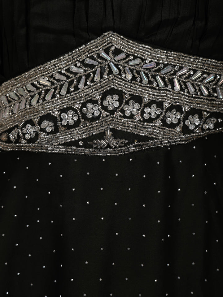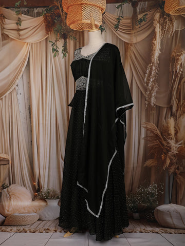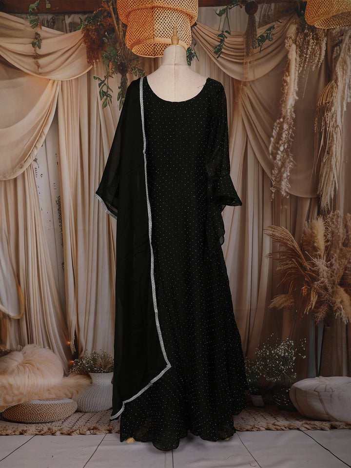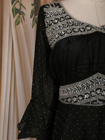 Radiate timeless elegance with this Black Embroidered Design Georgette Anarkali Gown with Dupatta, a perfect blend of sophistication and festive charm. Crafted from flowy georgette fabric, this gown showcases an exquisite stone work detailing along the neckline and waistline, adding a graceful shimmer to your look. The subtle dotted pattern throughout the fabric enhances its overall appeal, while the attached matching dupatta bordered with delicate embroidery completes the ensemble with a refined touch.