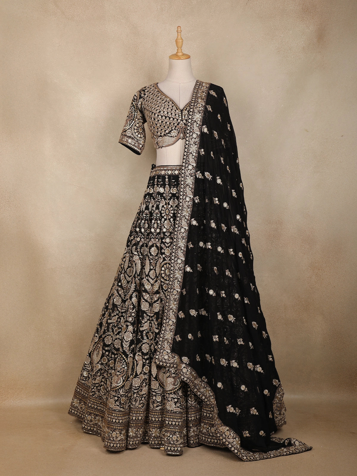 Step into royalty with this stunning black georgette lehenga set, beautifully highlighted with intricate floral and peacock embroidery. The detailed antique zari and sequin embellishments add a luxurious sparkle, making this ensemble perfect for grand celebrations.
