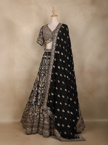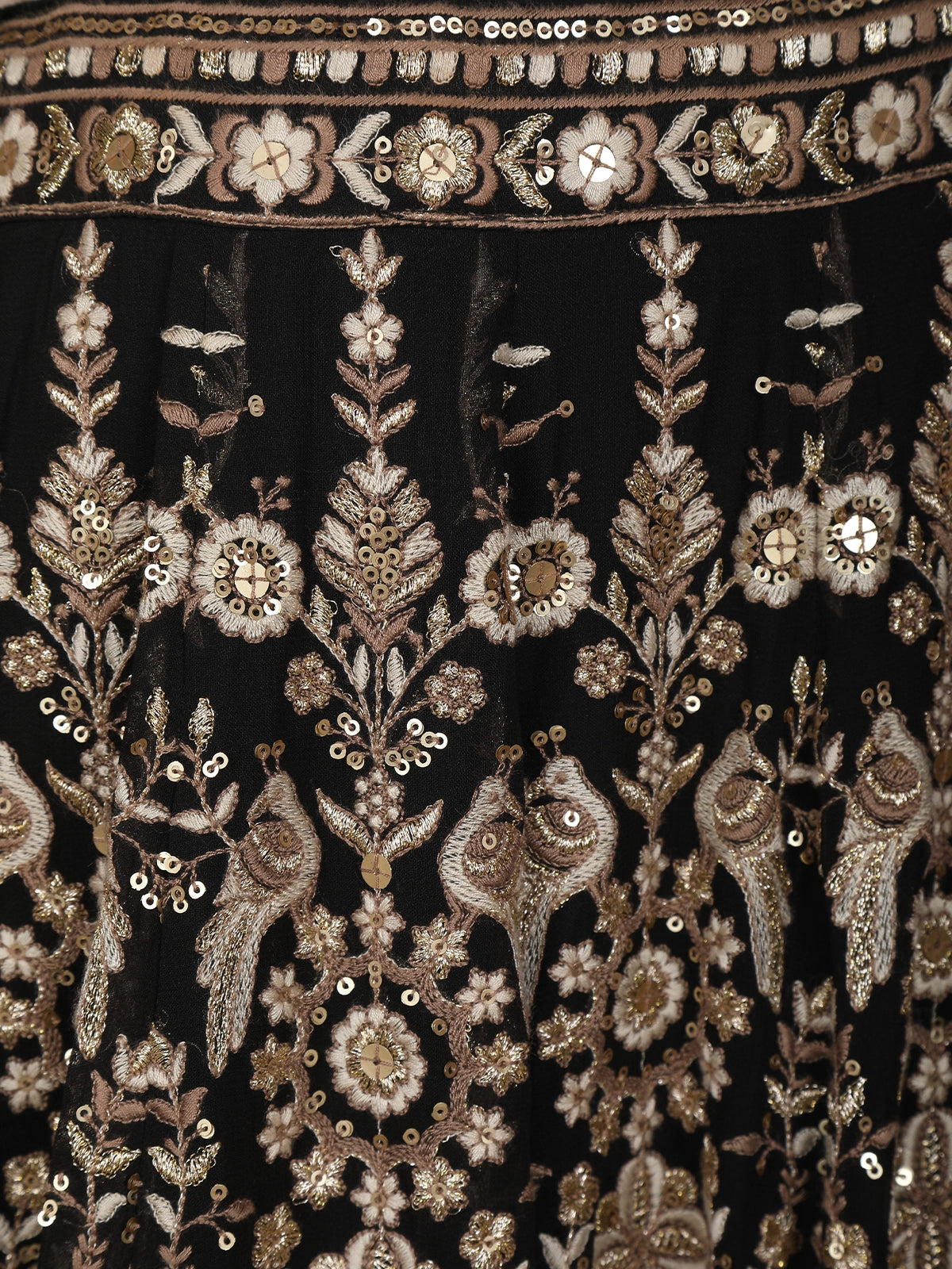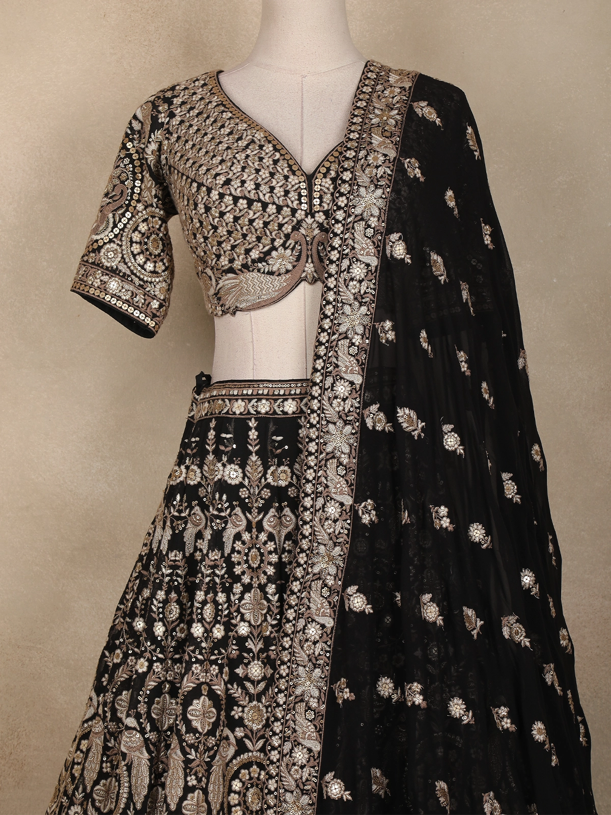 Black Floral and Peacock Embroidered Georgette Lehenga Set with Dupatta