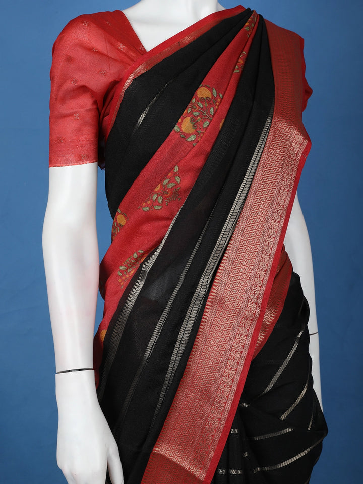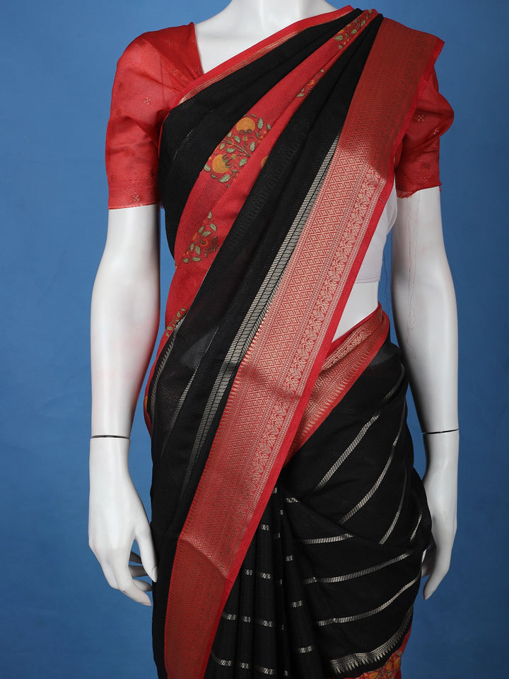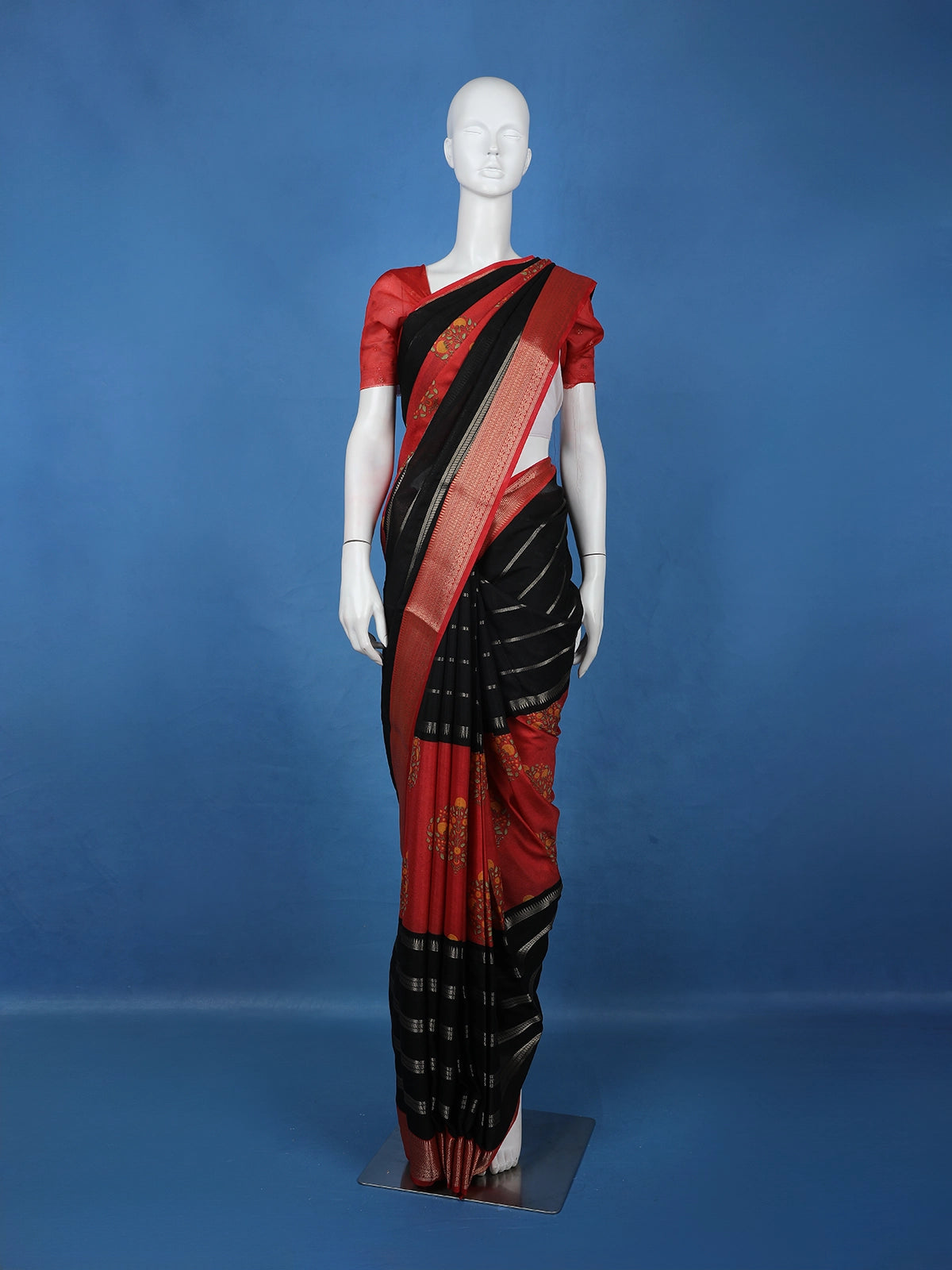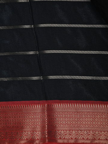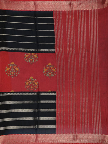 Drape yourself in the enchanting charm of this black and red Semi Tussar saree, a perfect blend of tradition and sophistication. The body of the saree is adorned with delicate silver zari stripes on a deep black base, creating a graceful contrast against the vibrant red pallu. Intricately woven floral buttas in warm tones add a festive touch, making it a true statement piece for celebrations.