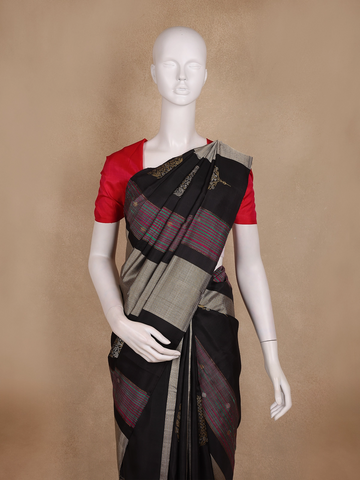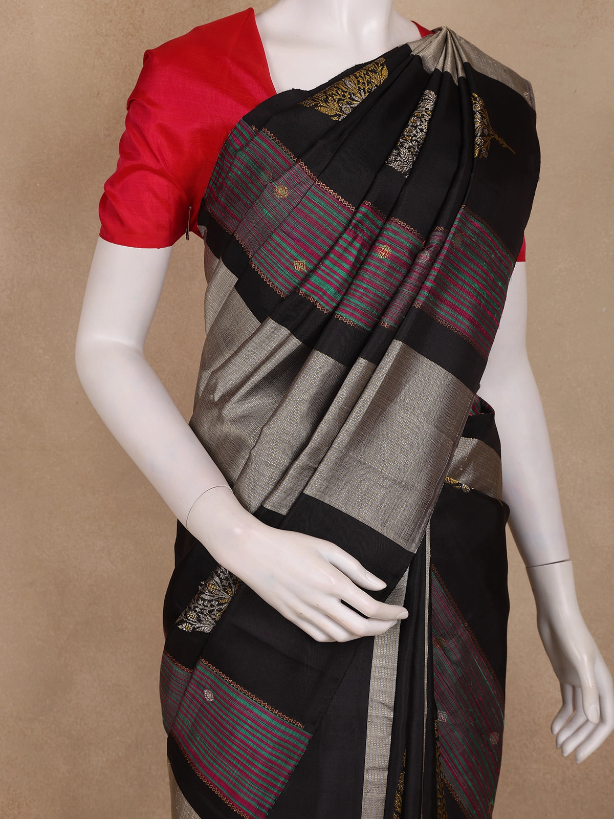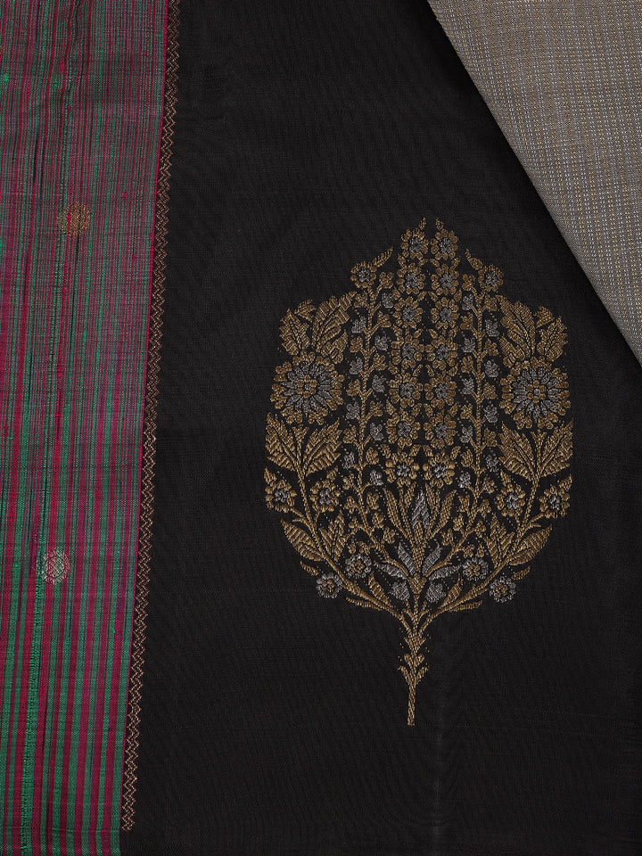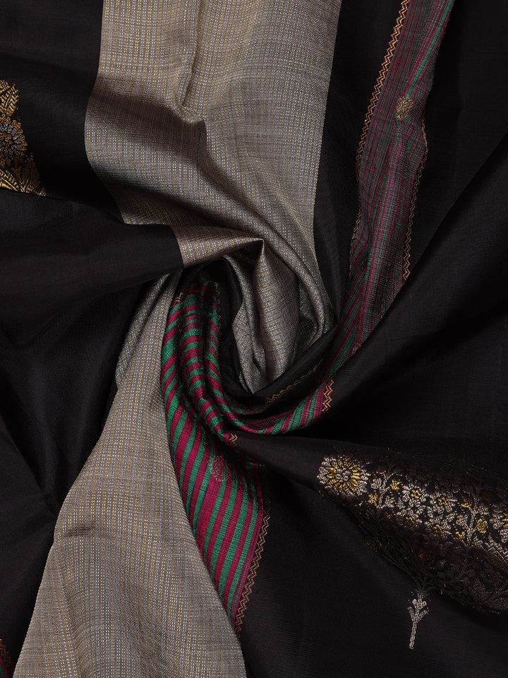Black Floral And Stripes Woven Kanchipuram Silk Saree