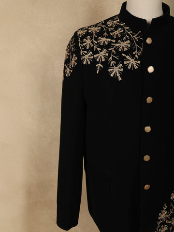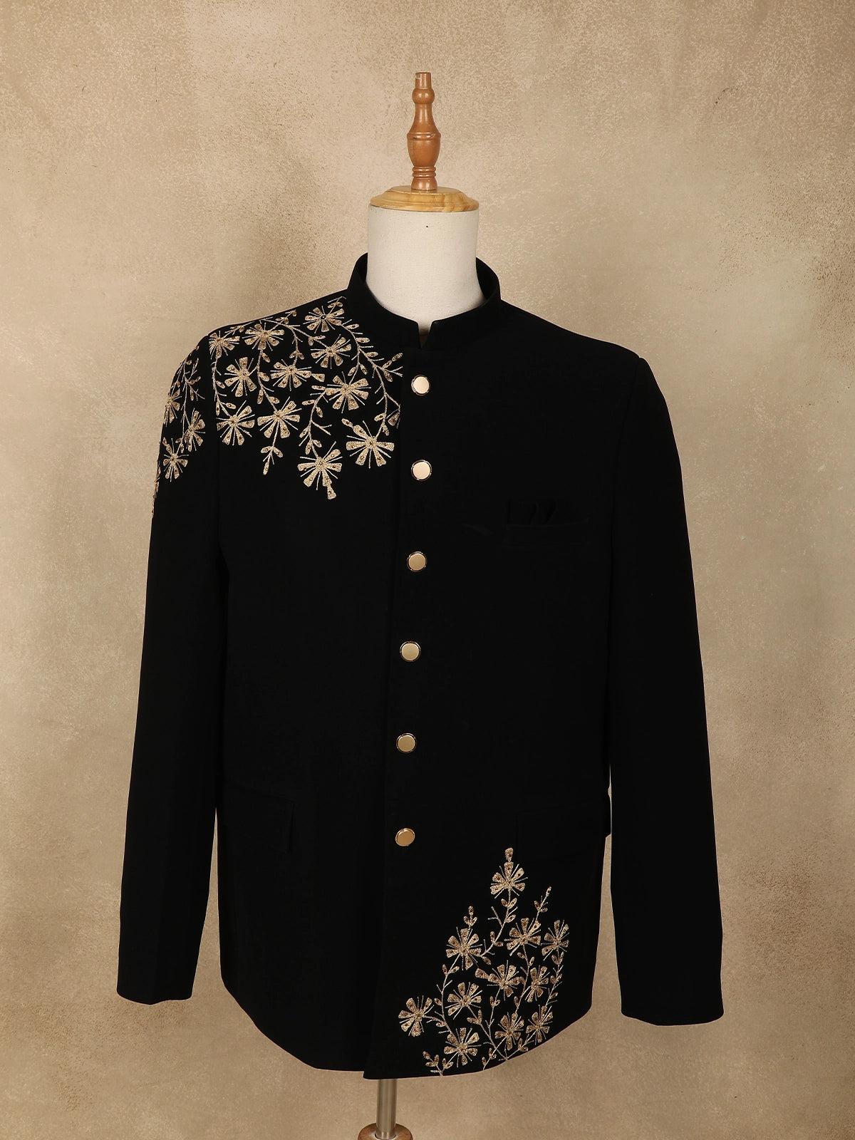 Black Floral Beads Embroidered Design Polynosic Men's Suit