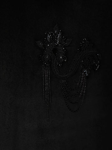The highlight lies in the intricate beads embroidery detailing on the shoulder panel, arranged in elegant cascading patterns that add depth and visual interest without overpowering the design. The embroidery seamlessly complements the solid velvet base, creating a perfect balance of sophistication and statement style.