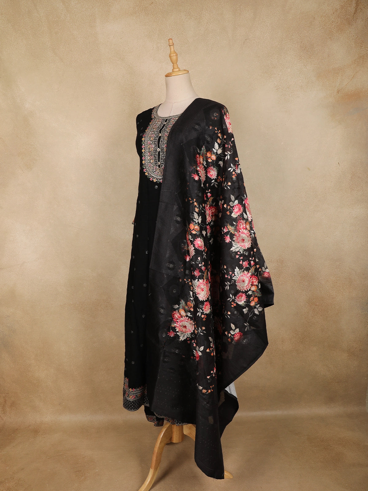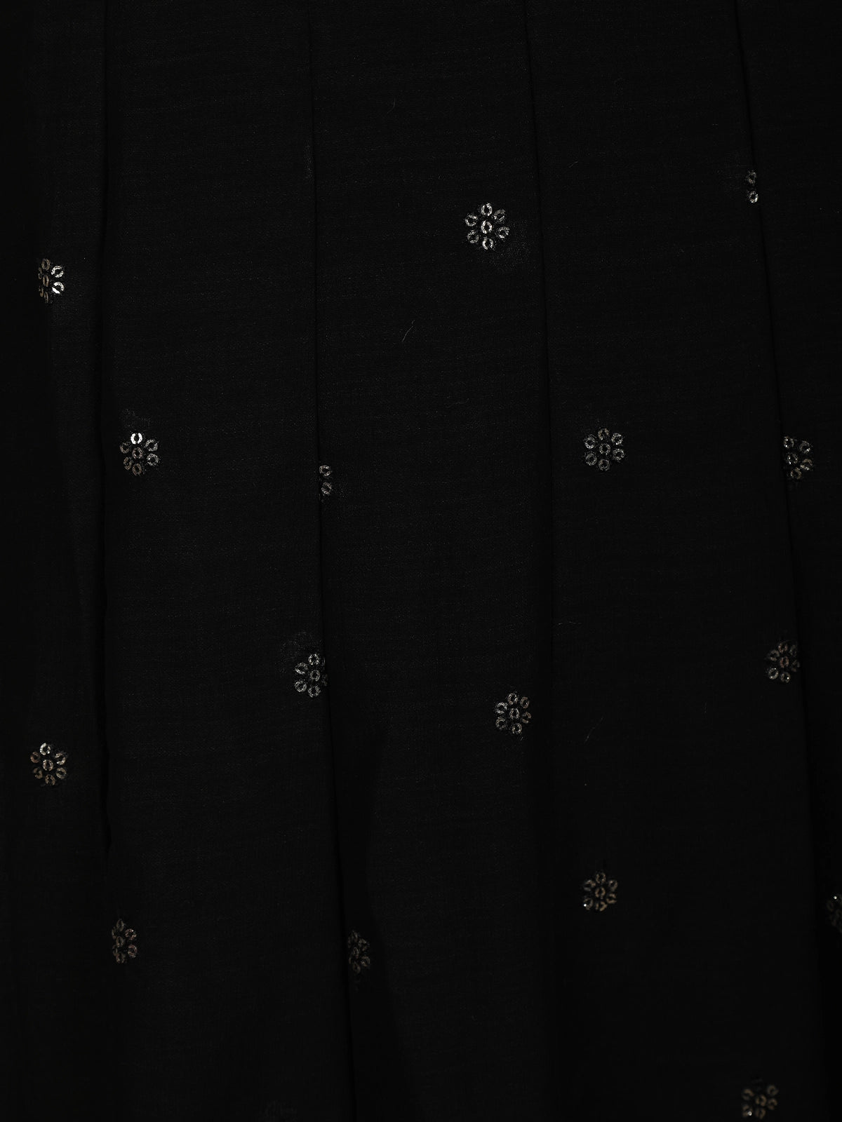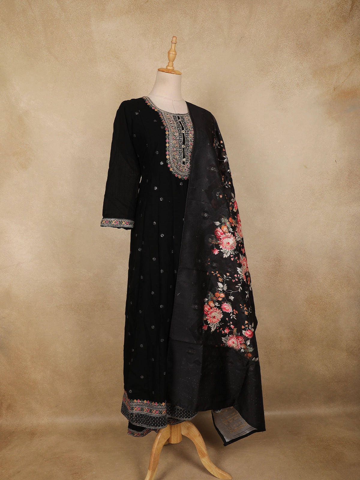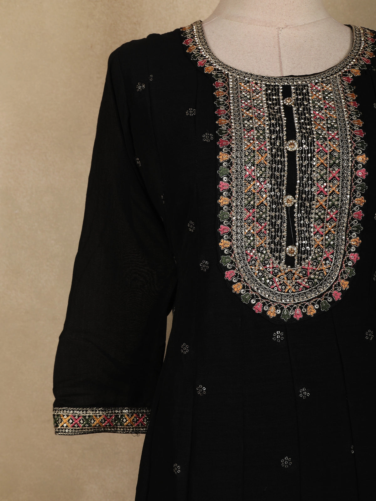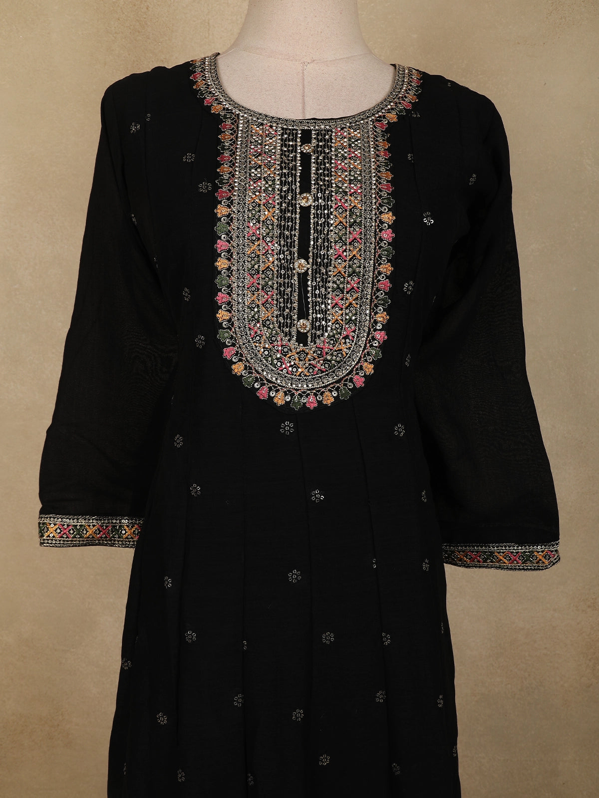 The straight cut kurta is crafted from lightweight georgette fabric in a rich black hue, adorned with subtle floral butta motifs that add texture and charm without overwhelming the design. The highlight of the kurta is its beautifully detailed embroidered neckline, featuring fine threadwork and delicate embellishments that lend a soft festive shimmer. Coordinated detailing at the sleeve cuffs and hemline completes the polished look.