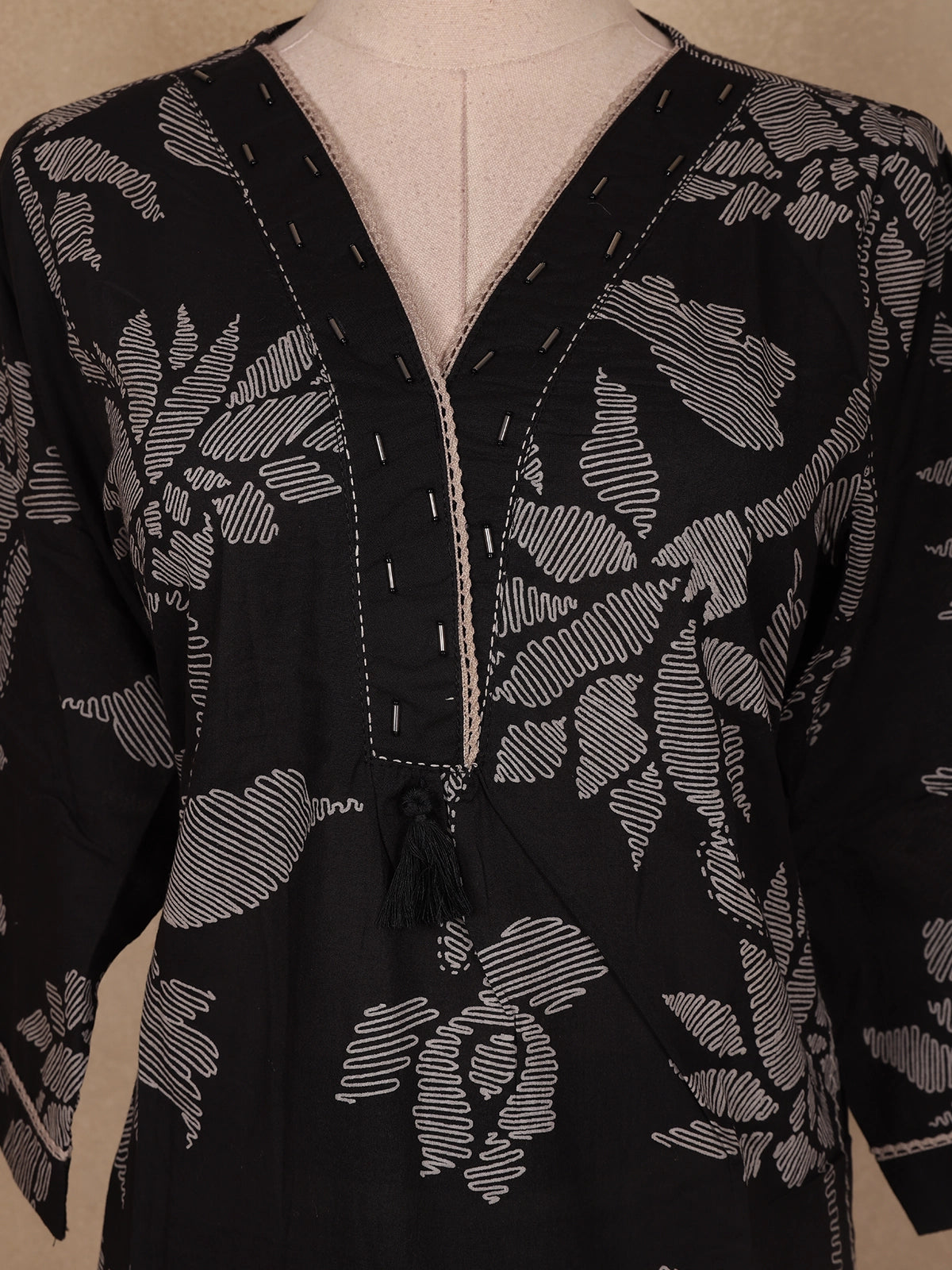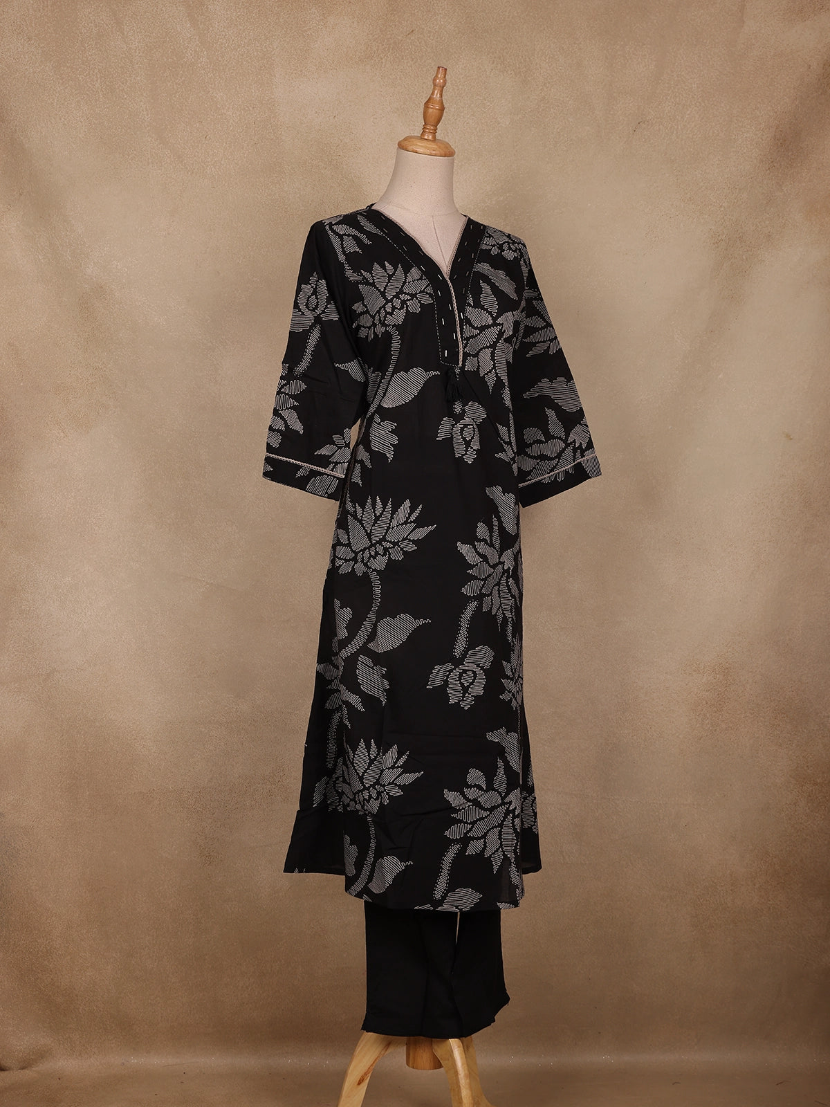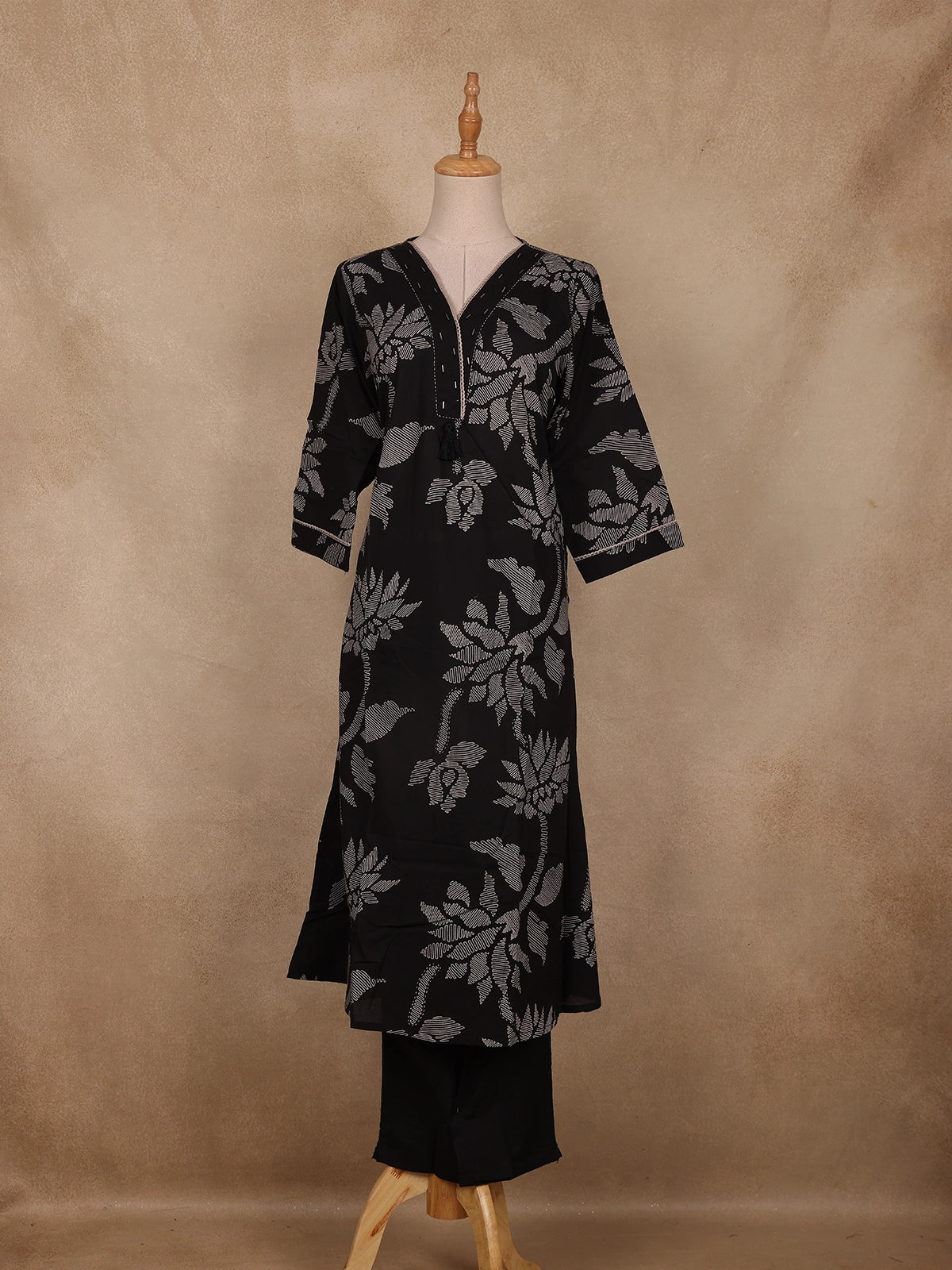 Step into effortless elegance with this Black Floral Design Cotton Salwar Suit — a blend of comfort and timeless charm. Crafted from breathable cotton fabric, the suit showcases delicate floral prints that exude understated sophistication. The V-neckline enhances the neckline beautifully, while the 3/4 sleeves add a graceful touch perfect for everyday wear or semi-casual gatherings. The outfit is designed without a dupatta, offering a sleek and contemporary look ideal for workwear or minimalistic styling.