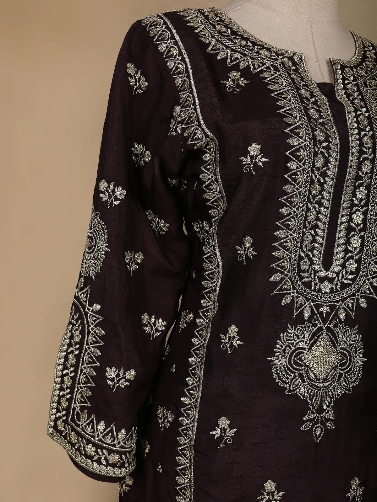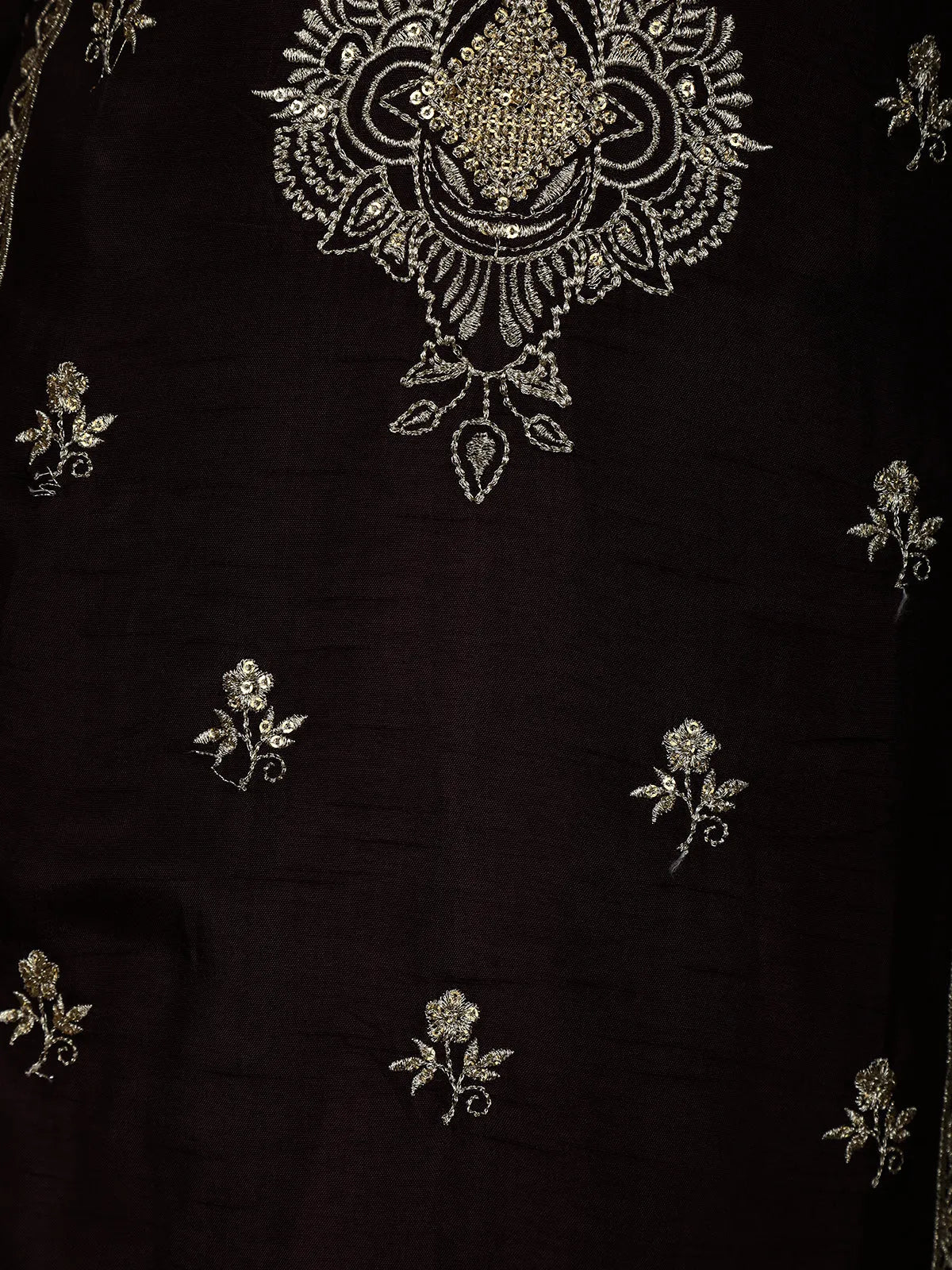 Channel timeless sophistication in this Black Floral Designed Raw Silk Salwar Suit, tailored to perfection for upscale gatherings and festive evenings. Crafted in rich raw silk, the straight-cut kurta offers a structured silhouette that enhances your natural shape while providing a luxurious feel and elegant sheen.