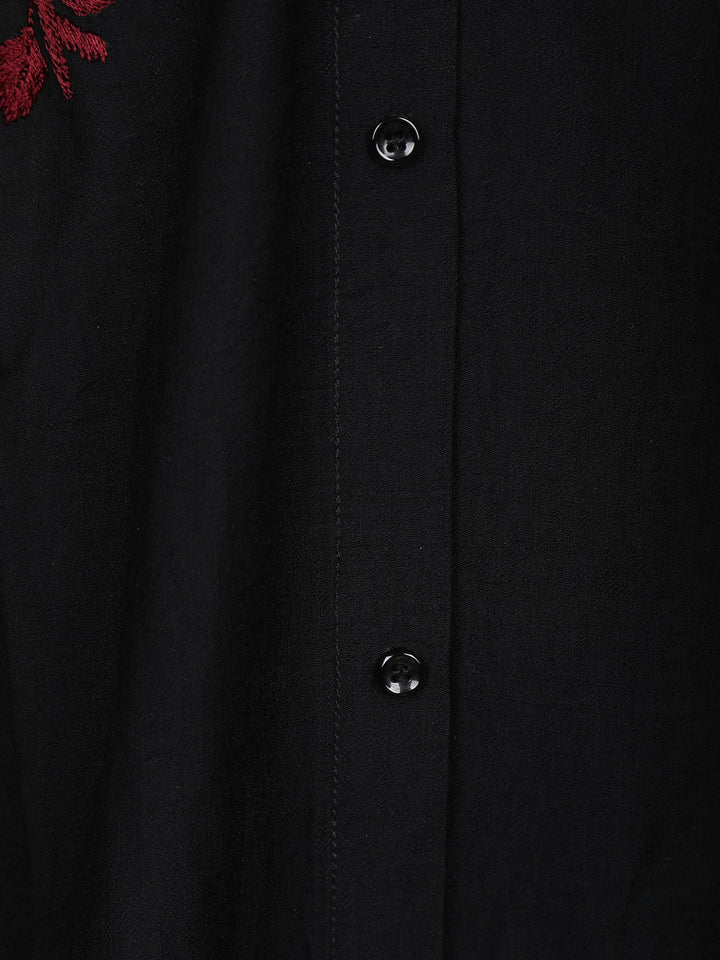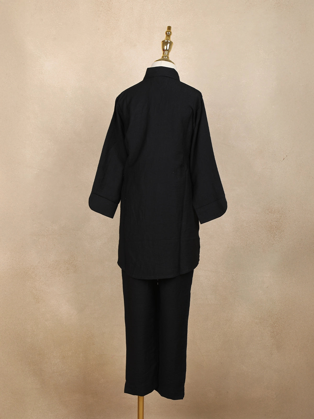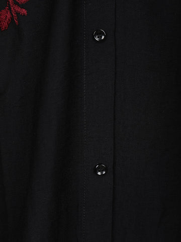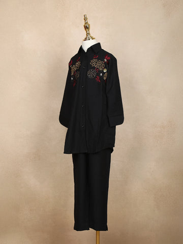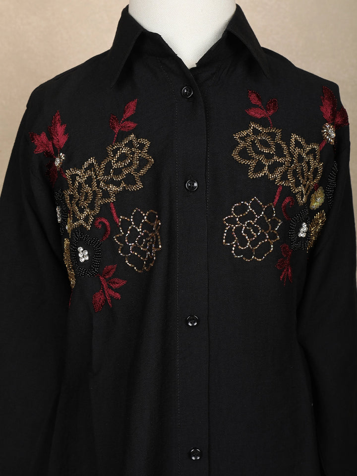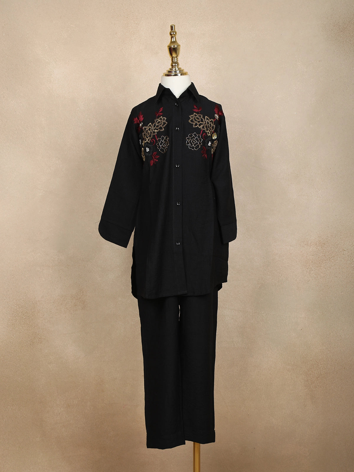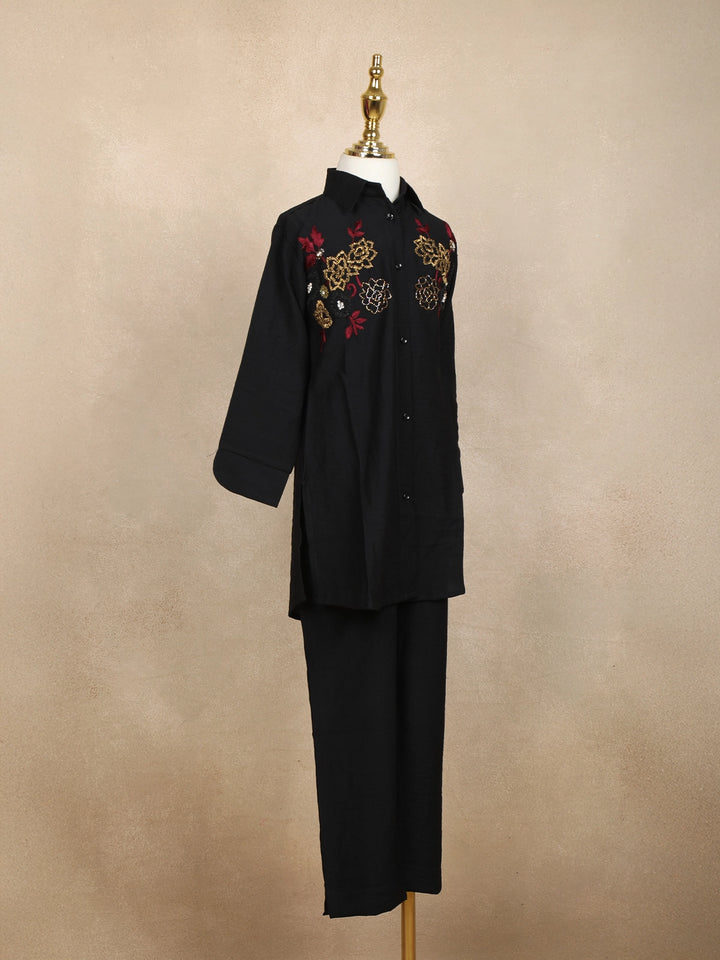 Elevate your everyday style with this elegant black co-ord set featuring a button-down shirt and straight-fit trousers. The front yoke is beautifully adorned with intricate floral embroidery in metallic gold and deep maroon threadwork, highlighted with delicate bead and sequin embellishments for a subtle festive shimmer. Crafted from soft, breathable cotton fabric, this outfit ensures all-day comfort while keeping your look effortlessly polished.