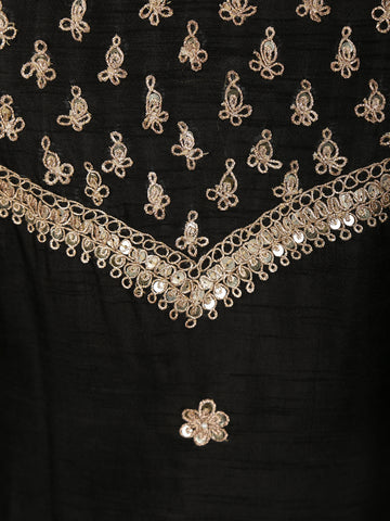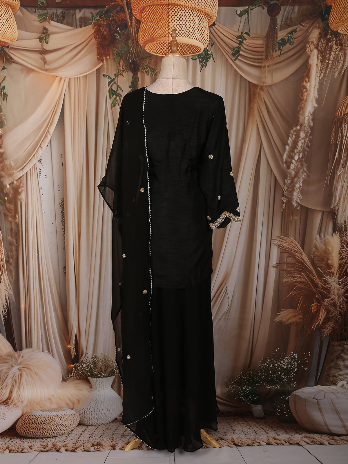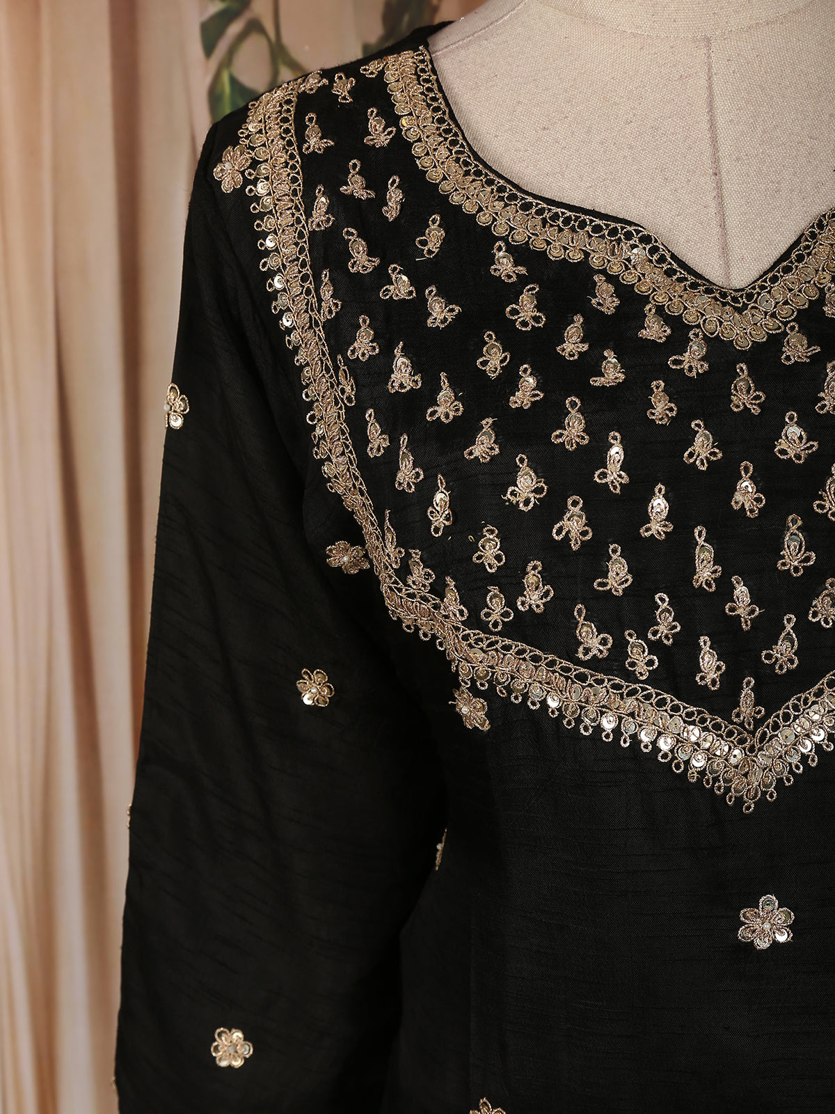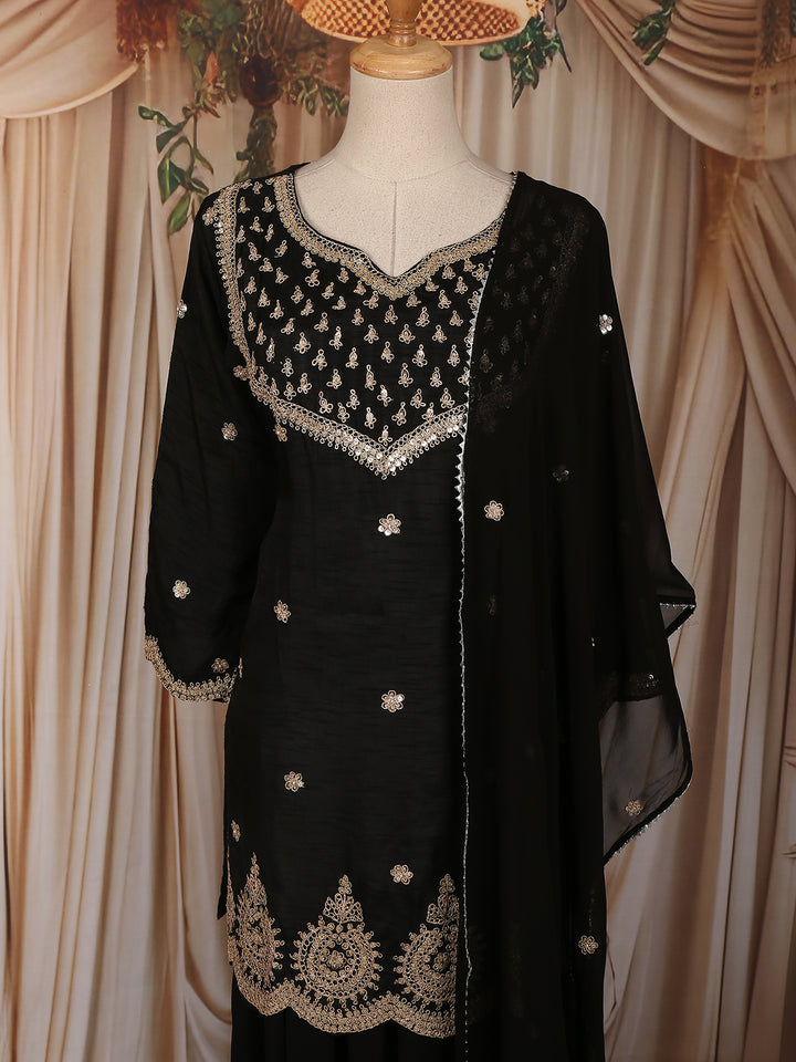 Elegance meets understated luxury in this stunning black georgette lehenga set. Designed with finely done floral thread and sequin embroidery, this outfit exudes a graceful charm that is perfect for festive evenings, parties, and family celebrations. The soft-flowing georgette fabric lends beautiful movement, while the intricate embroidery highlights the neckline, hem, and sleeves, giving the ensemble a refined and timeless appeal.