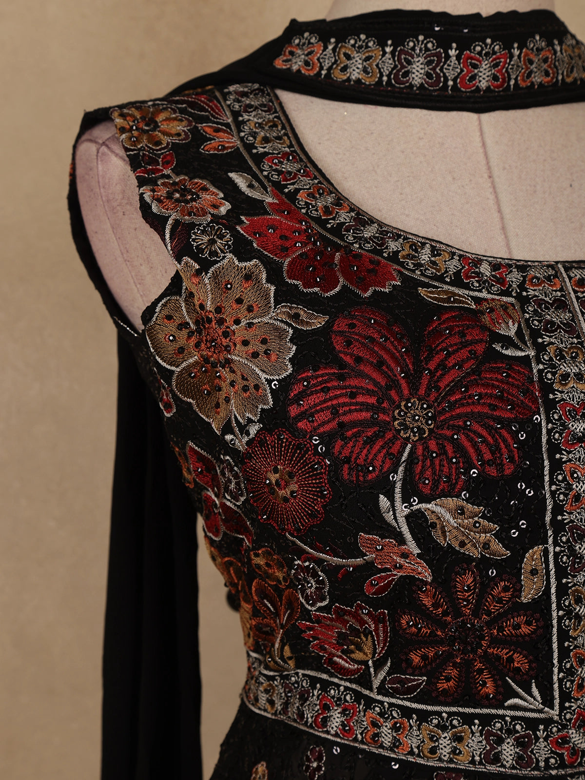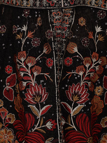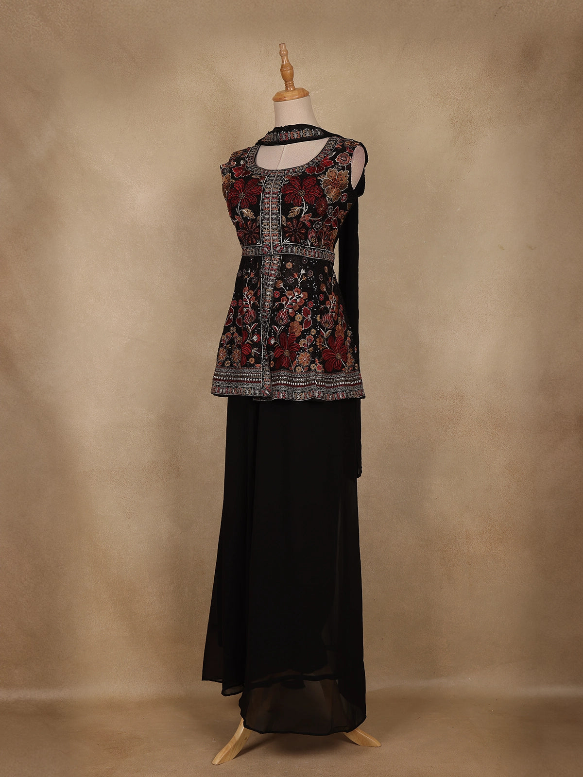 Radiate elegance with this stunning Black Floral Embroidered Georgette Palazzo Suit. The sleeveless short kurti features exquisite floral embroidery enhanced with delicate zari and sequin accents that shimmer beautifully against the dark backdrop. The U-shaped neckline adds a refined feminine touch, while the airy georgette palazzo provides both comfort and style. Completed with a flowing georgette dupatta, this ensemble is perfect for festive occasions, parties, or evening celebrations. The balance of intricate craftsmanship and graceful flow makes this outfit an effortlessly chic addition to your wardrobe.