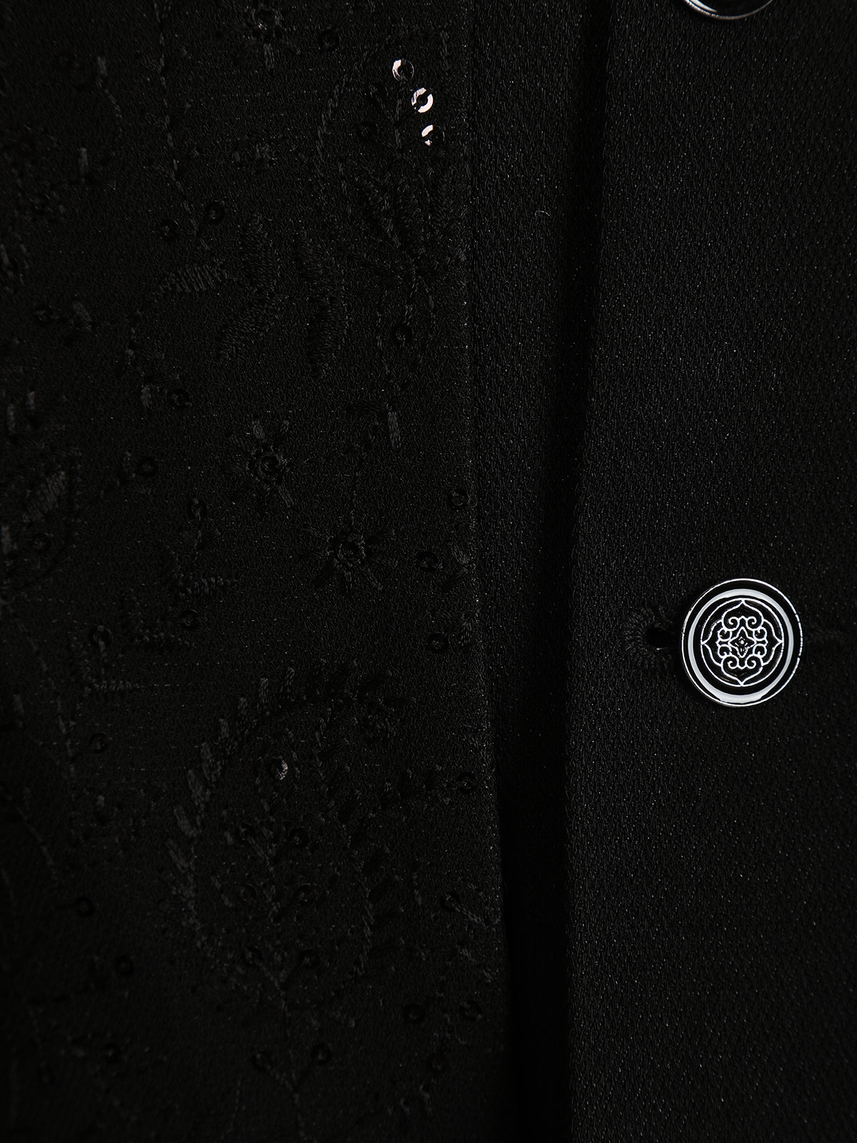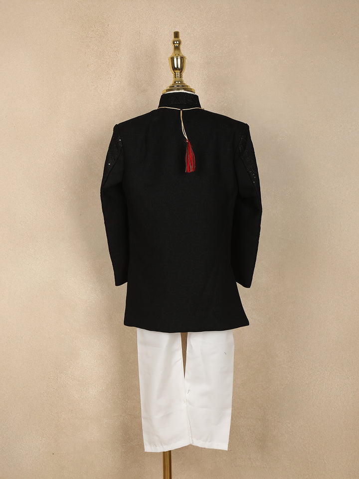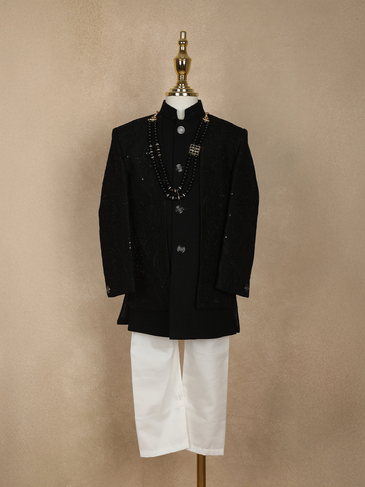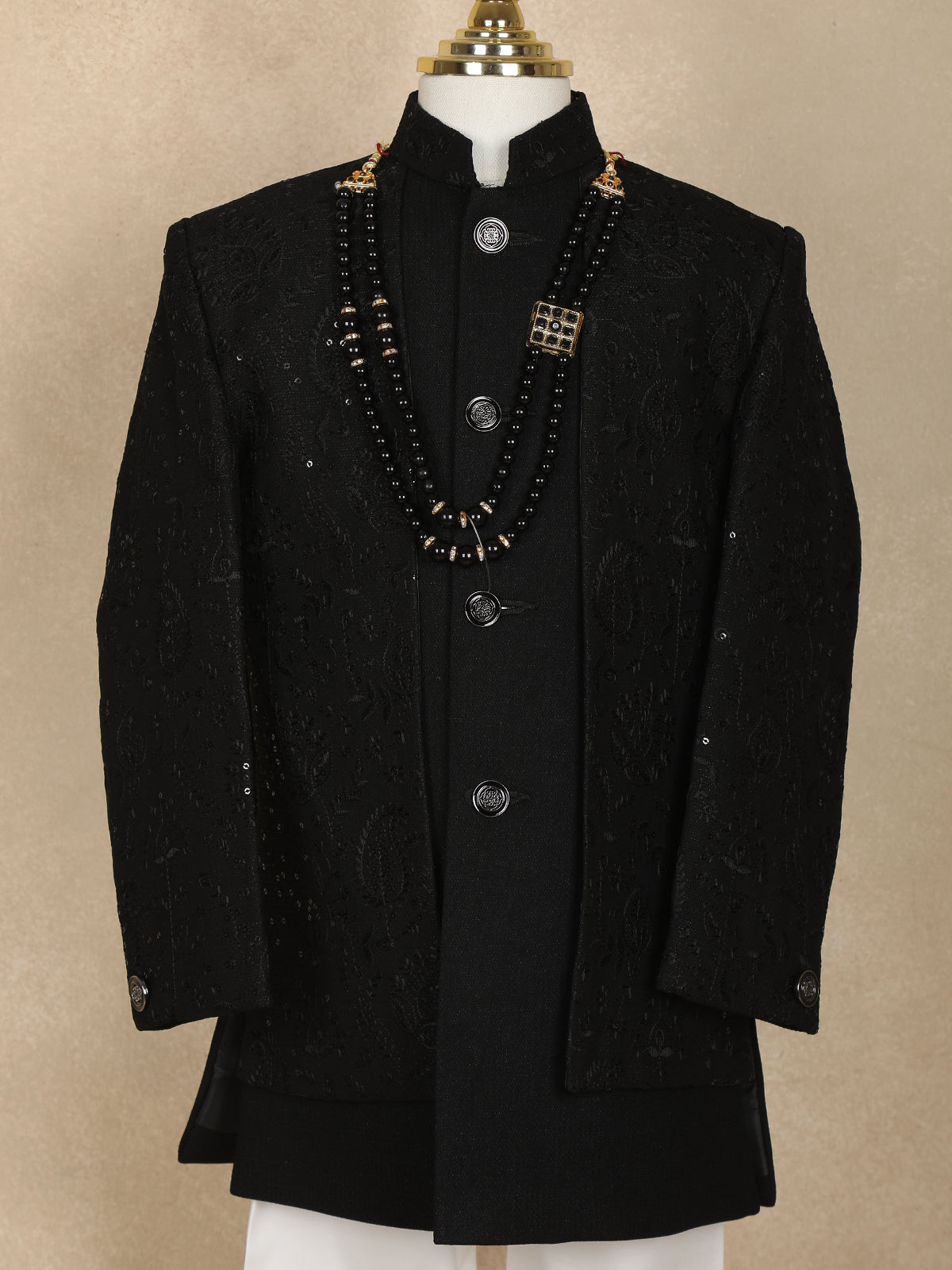 Black Floral Embroidered Kids Polyester Sherwani Set with White Pants
