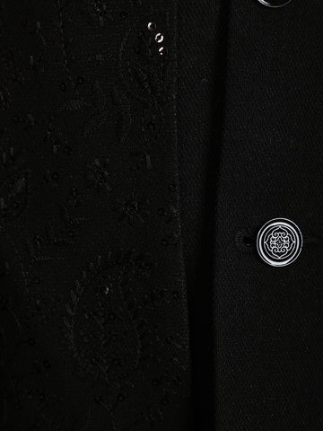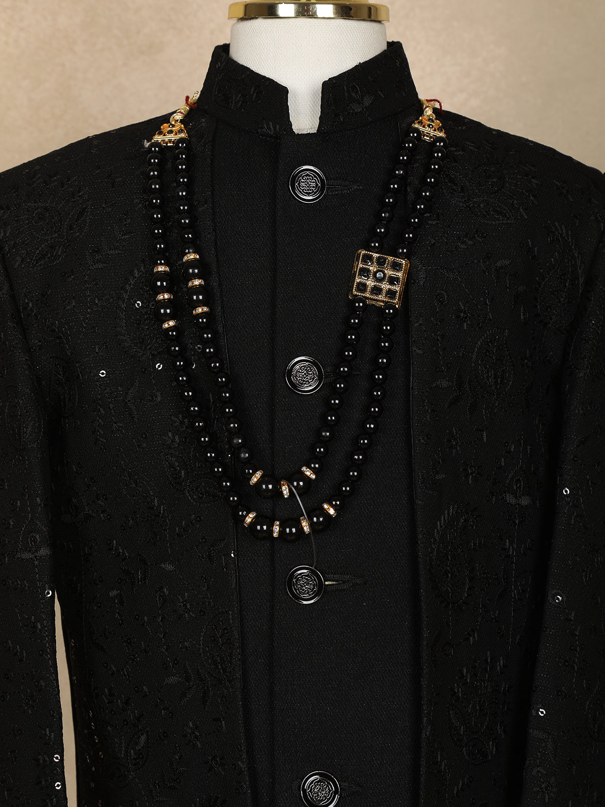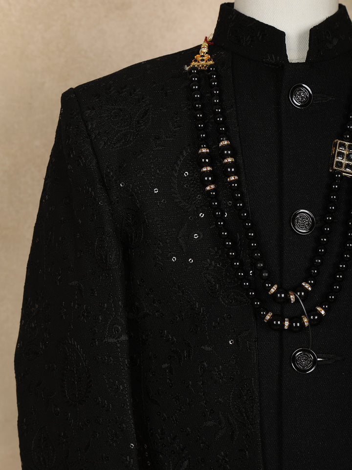 Give your little prince a bold and timeless festive look with this exquisite black sherwani set. Crafted in rich Polyester fabric, the outfit features intricate tonal embroidery with subtle sequin highlights that add a touch of shimmer to every movement. The pearl-beaded black mala enhances the royal elegance of the ensemble.