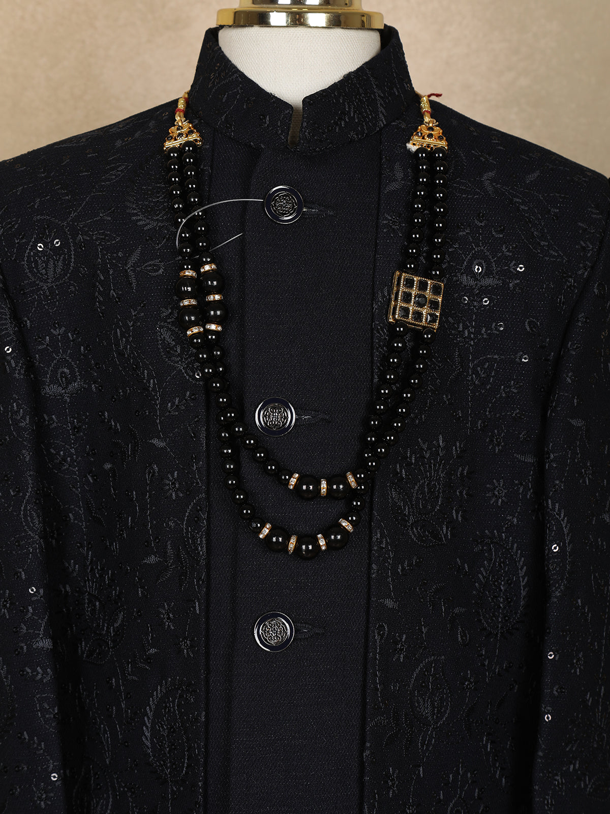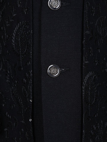 Add a regal touch to your little one’s festive wardrobe with this stylish Black Floral Embroidered Polyester Sherwani Set. The sherwani features intricate floral embroidery with subtle sequin highlights, crafted to offer a rich and sophisticated look. The mandarin collar and designer metallic buttons enhance its traditional charm.