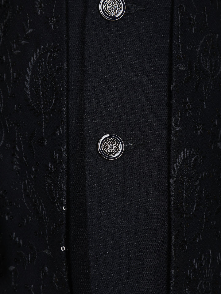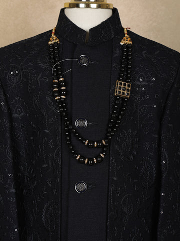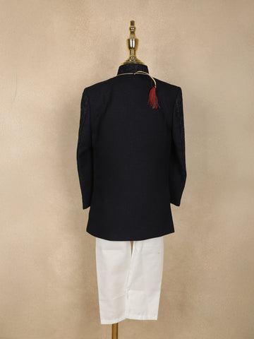 Black Floral Embroidered Polyester Kids Sherwani Set with White Pants
