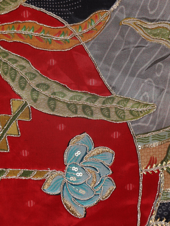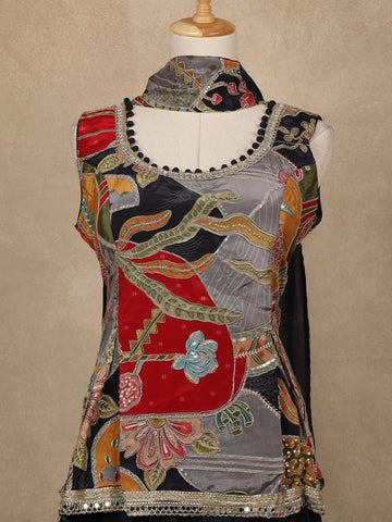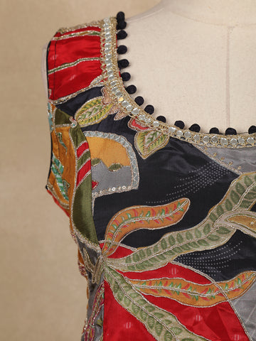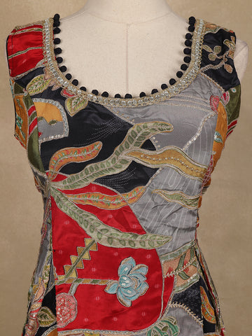 Turn heads with this exquisite Multicolor Patchwork Embroidered Silk Palazzo Suit, a stunning blend of traditional artistry and modern flair. The top features a vibrant mix of patchwork patterns in shades of red, grey, green, mustard, and blue, adorned with intricate thread and sequin embroidery. The neckline is accentuated with a charming pom-pom lace border, adding a playful touch to its ethnic appeal.