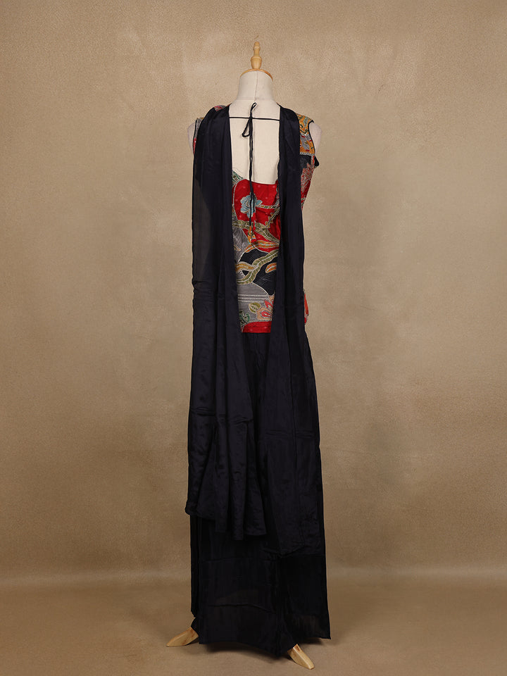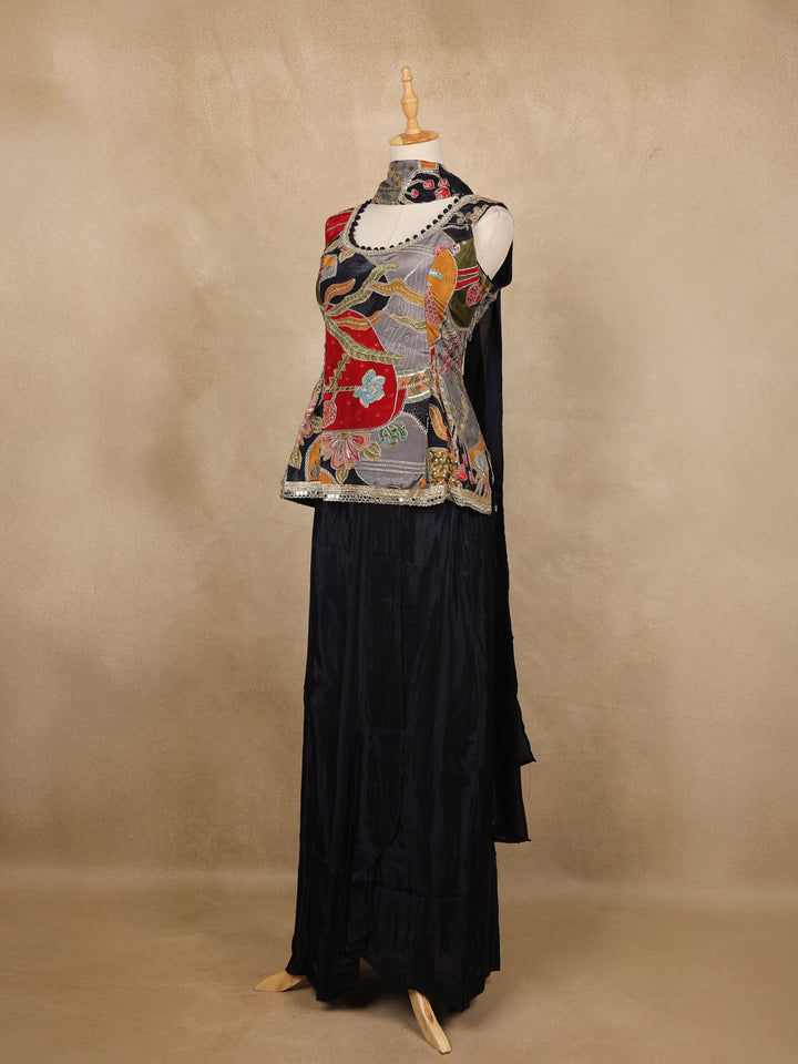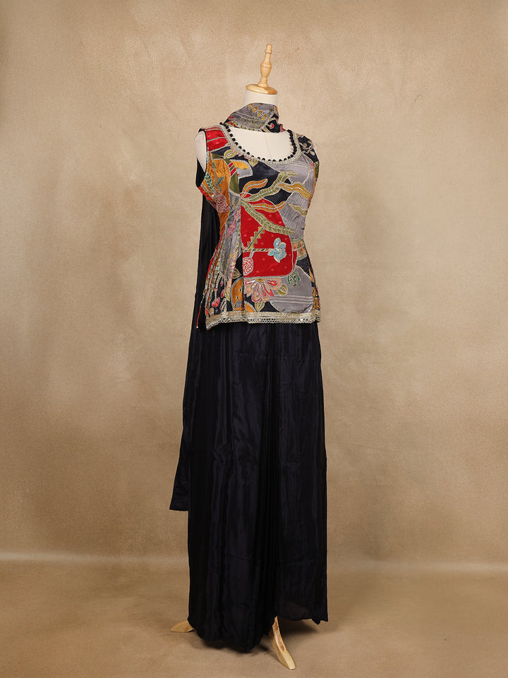Paired with a flowy black silk palazzo and a plain matching dupatta, this outfit radiates effortless elegance and festive charm. Perfect for special occasions, cultural gatherings, or evening parties, it offers a fusion of comfort and creativity for the modern woman who loves standing out in style.