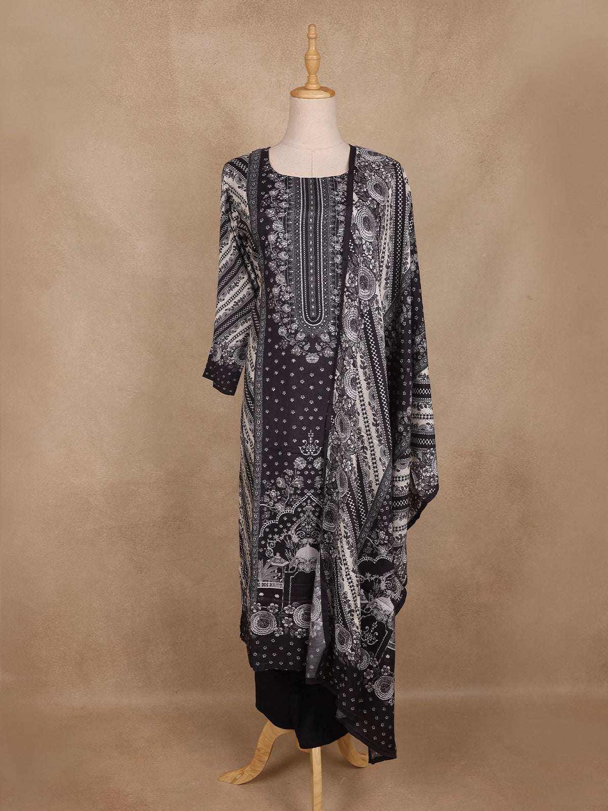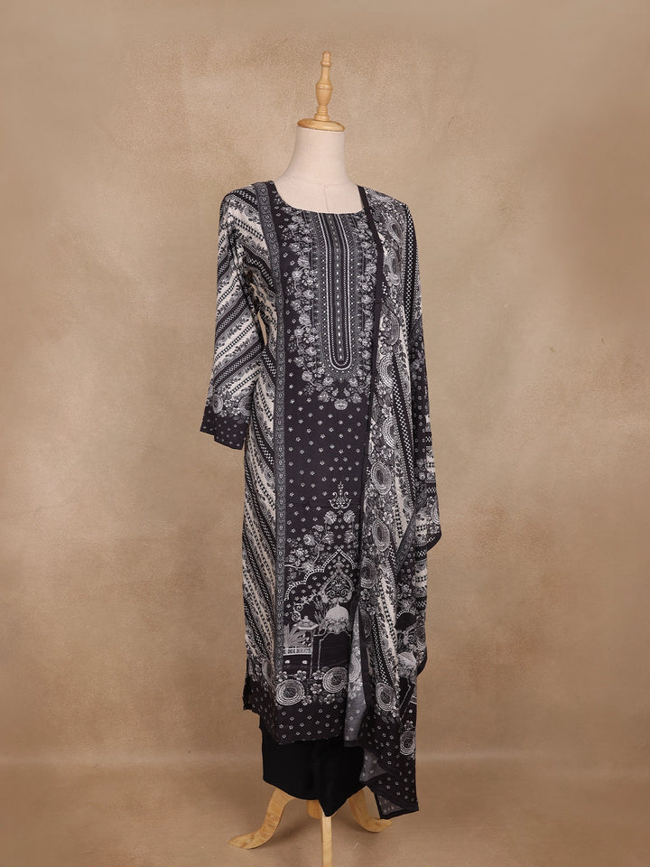 The square neckline and full sleeves enhance its structured silhouette, while the matching printed dupatta adds a graceful finishing touch. Perfect for casual wear, office attire, or ethnic gatherings, this ensemble ensures ease of movement and all-day comfort while keeping your look effortlessly polished.