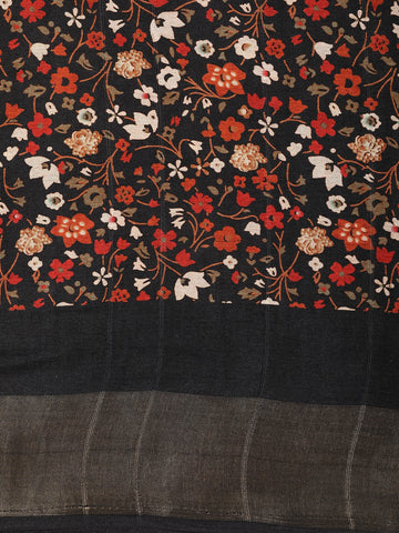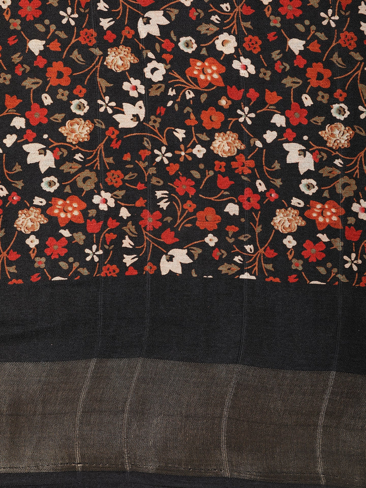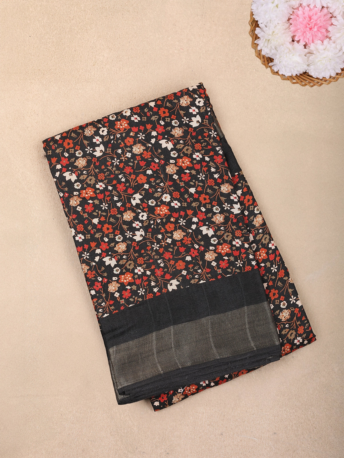 Black Floral Printed Chanderi Cotton Saree with Contrast Border