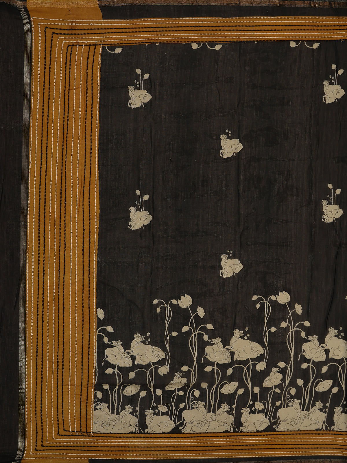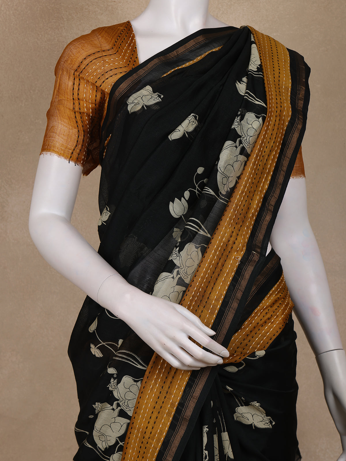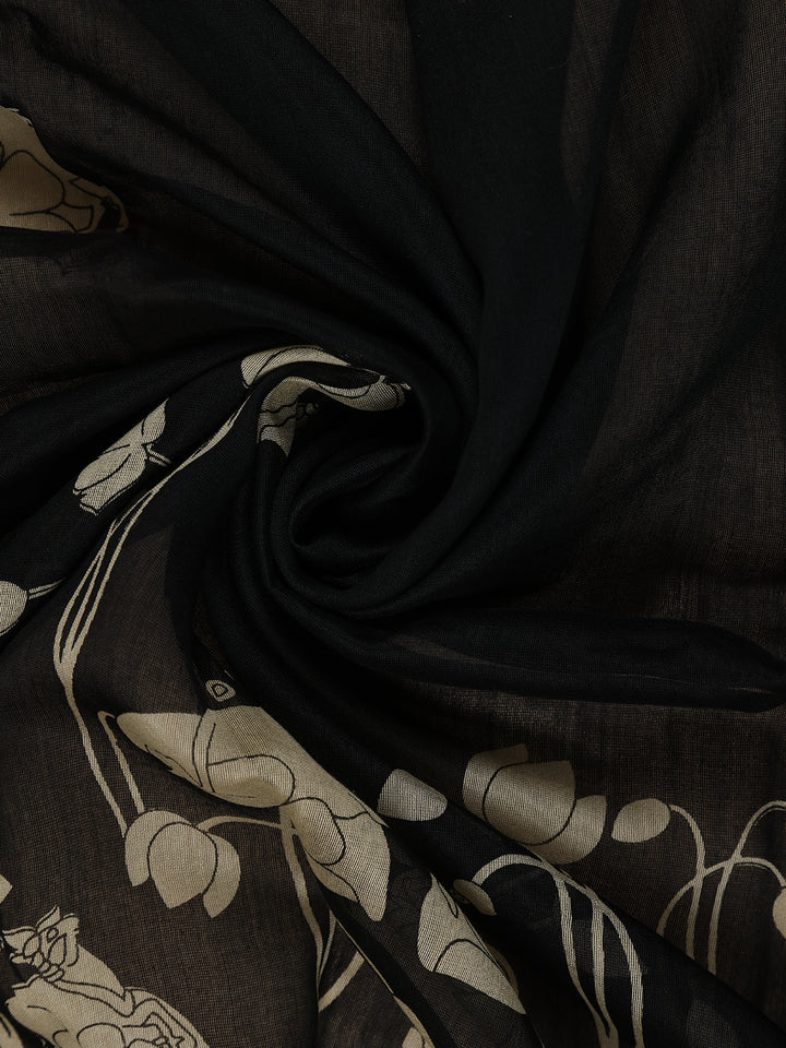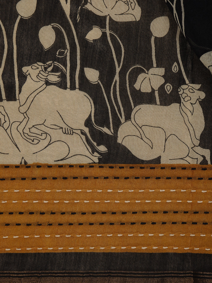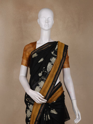 Black Floral Printed Chanderi Cotton Saree with Contrast Mustard Border