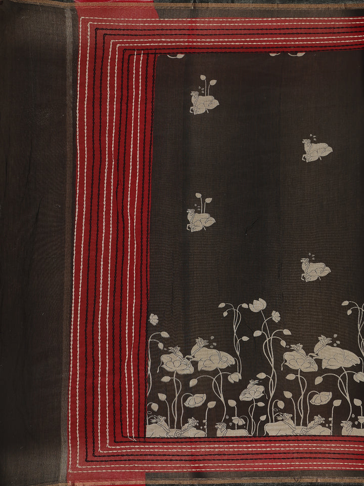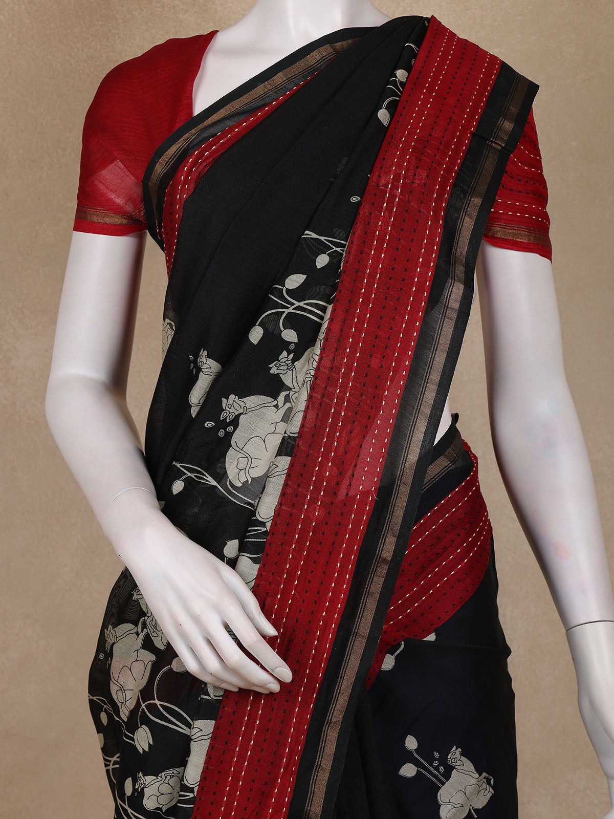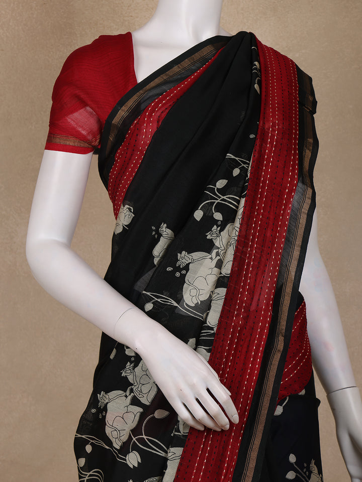Black Floral Printed Chanderi Cotton Saree with Contrast Red Border