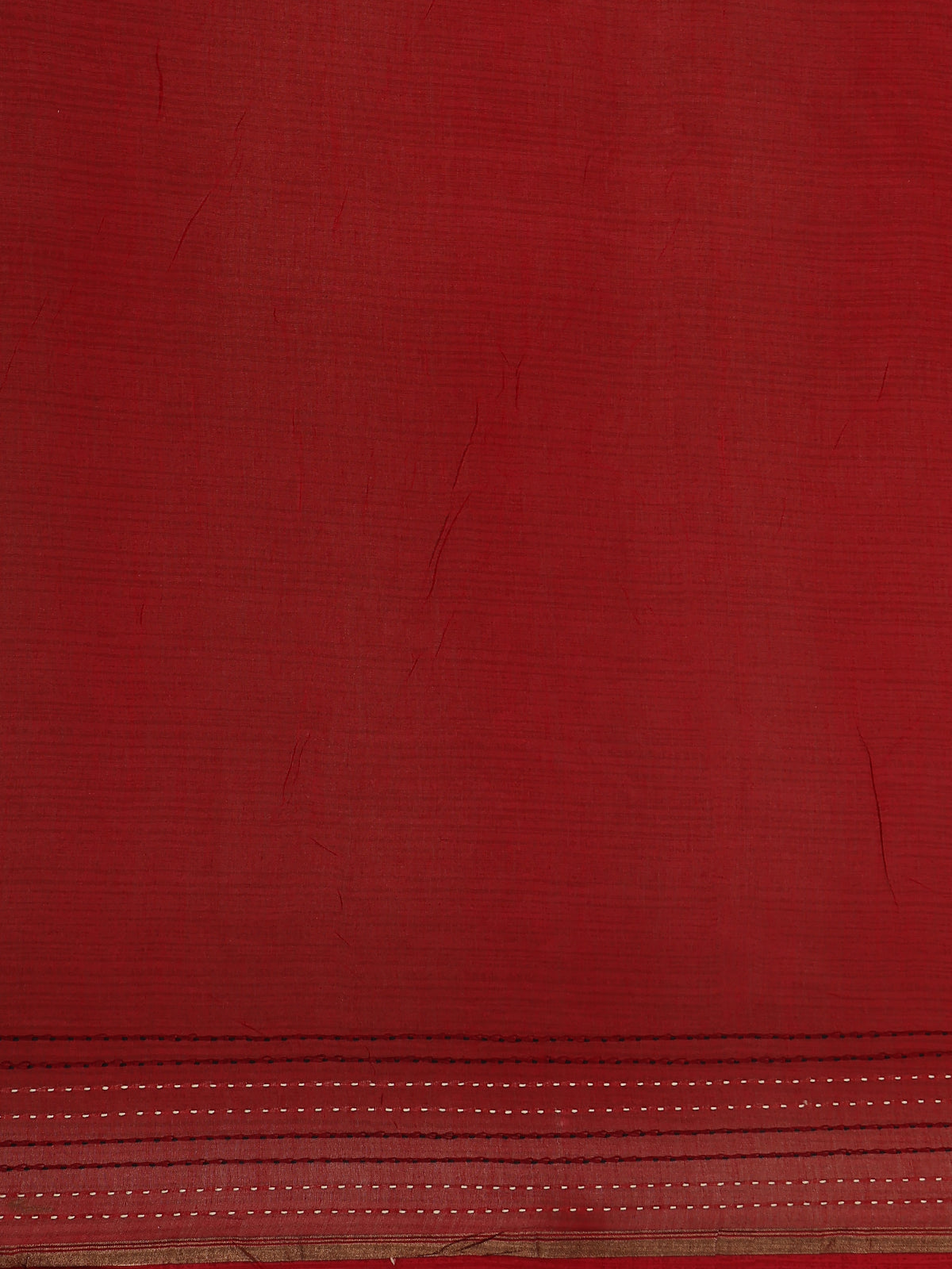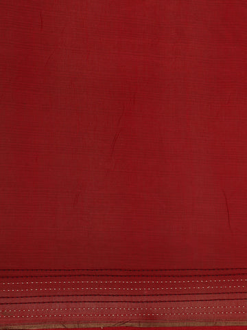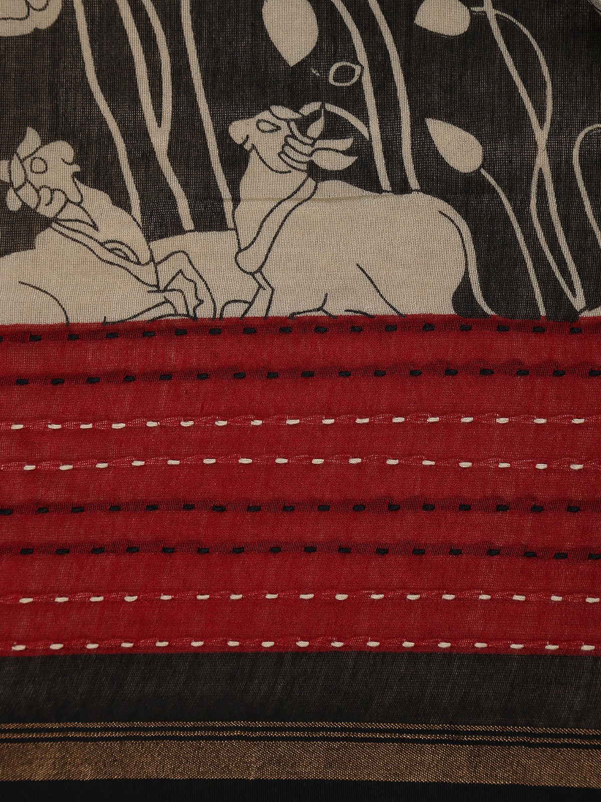 Elegantly crafted in Chanderi Cotton, this black saree features subtle ivory floral printed motifs that add a soft artistic charm to the drape. The highlight of the saree is its stunning contrast deep red border, adorned with delicate running stitch-style detailing and a fine antique golden zari lining, giving it a graceful traditional finish.