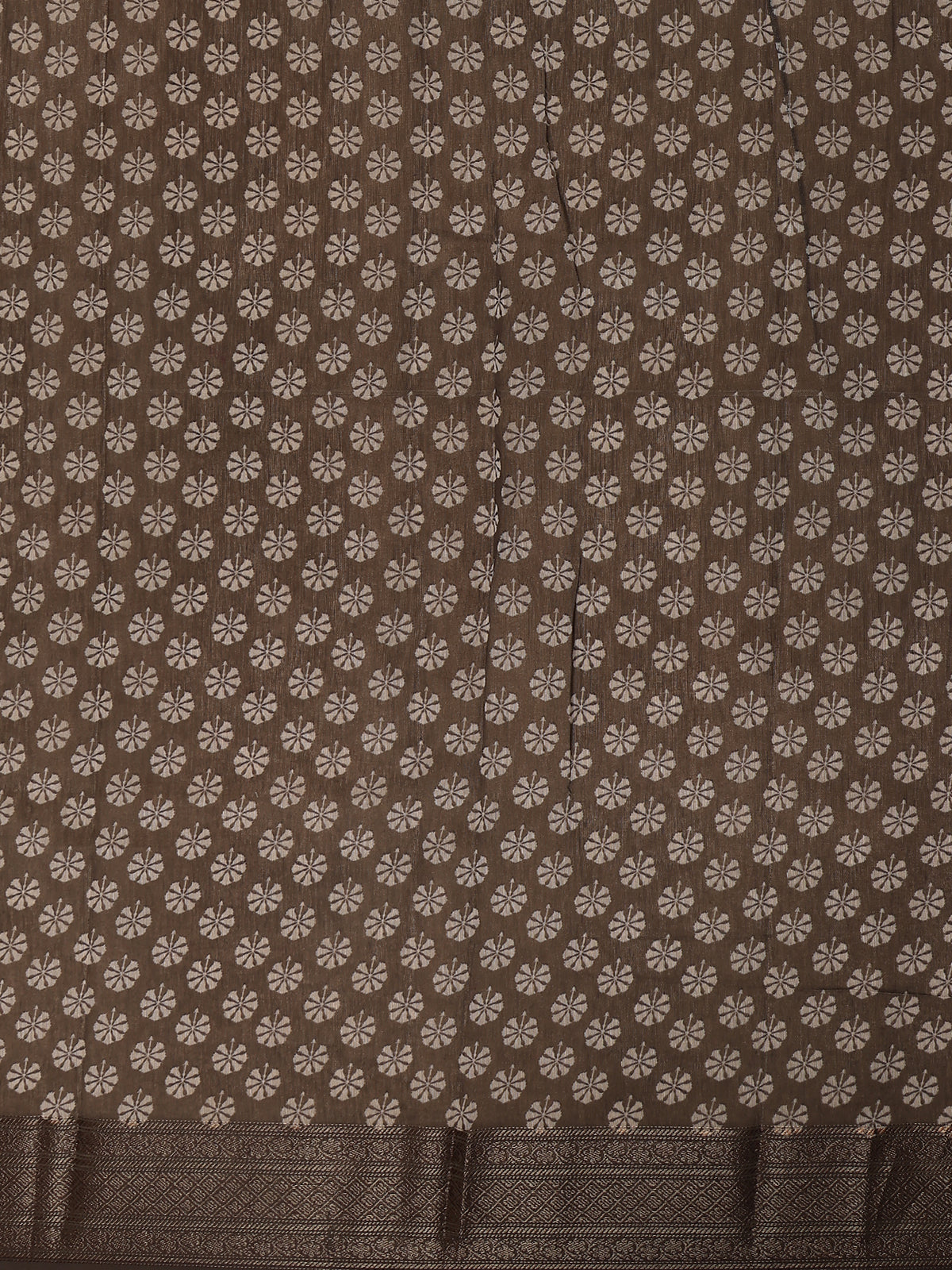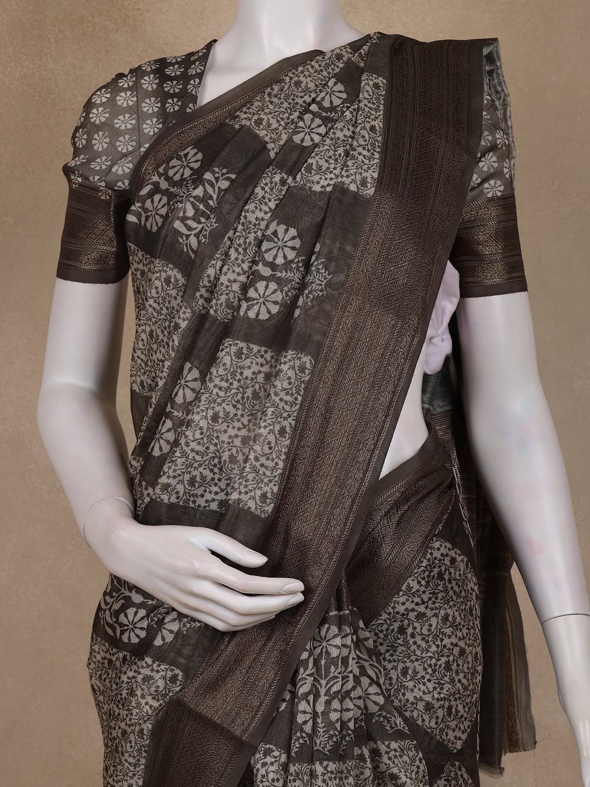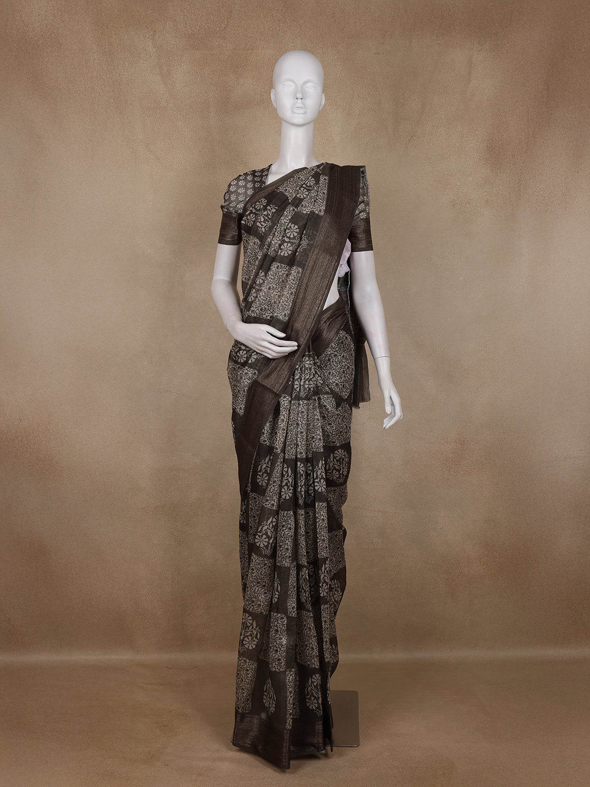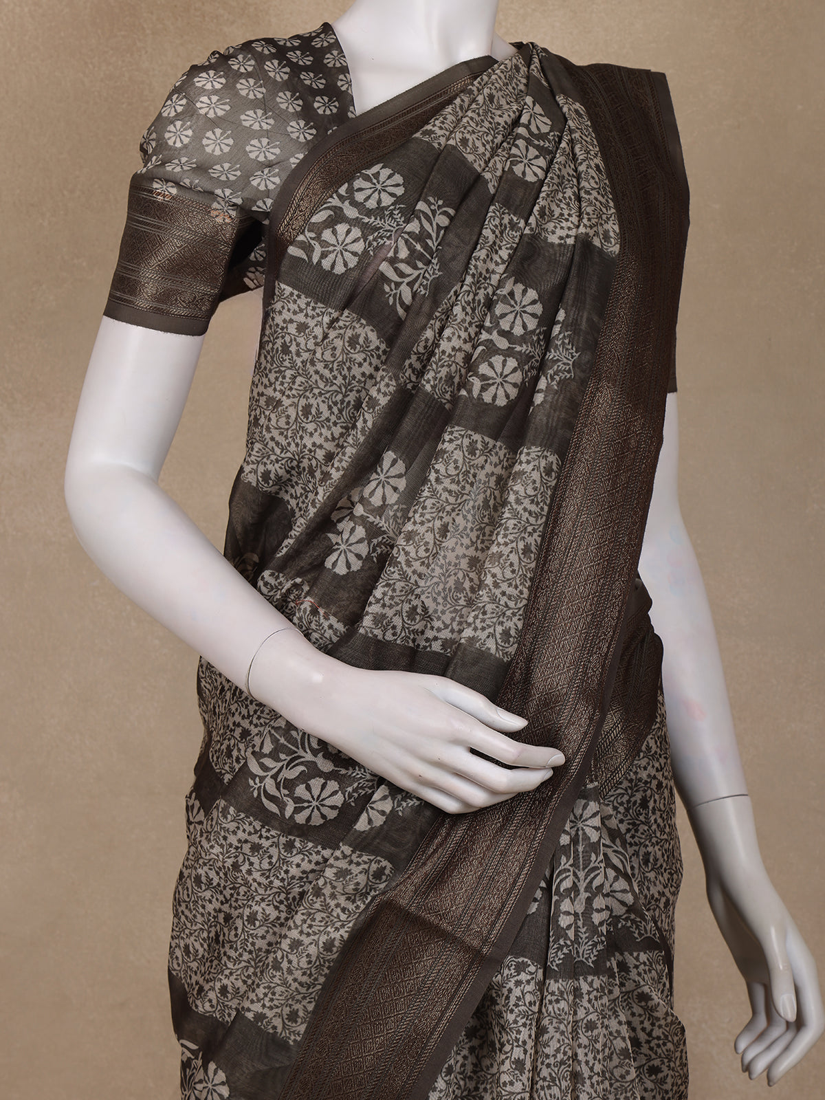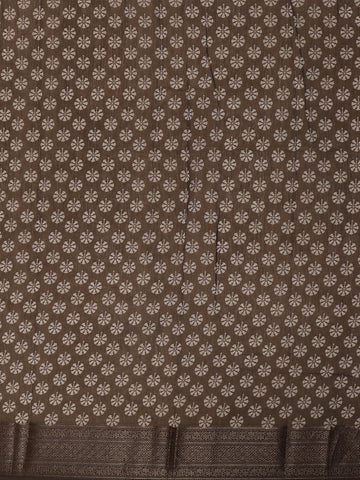 The saree is finished with a beautifully woven zari border that enhances its ethnic charm and gives it a classic festive finish. The matching pallu flows seamlessly with the overall design, adding continuity and elegance. It comes paired with a matching printed blouse, allowing you to achieve a complete coordinated look with ease.