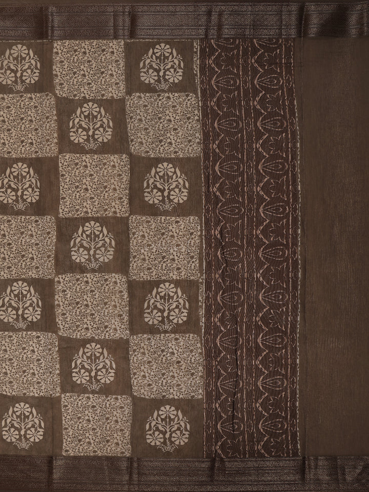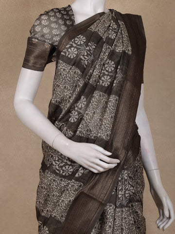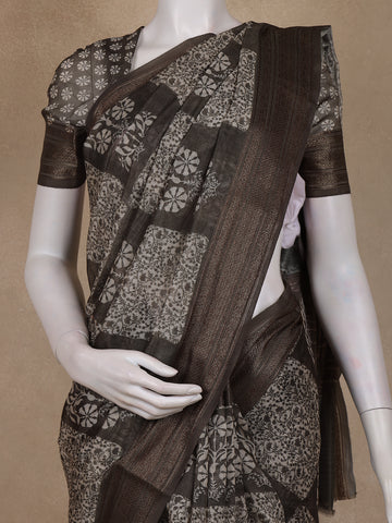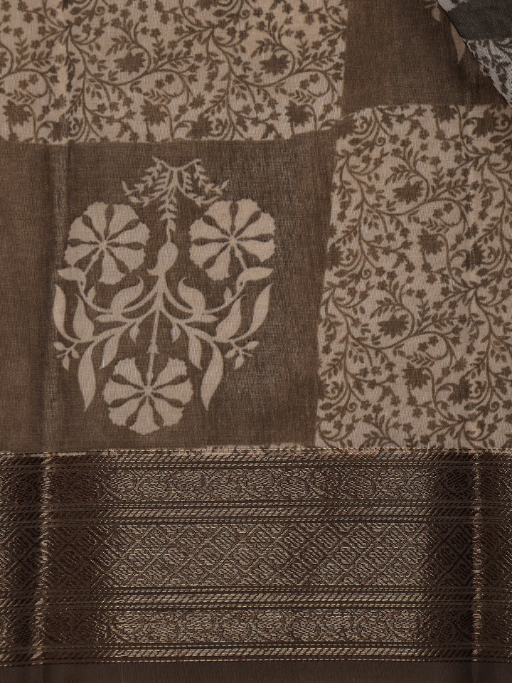 Black Floral Printed Chanderi Cotton Saree with Zari Border