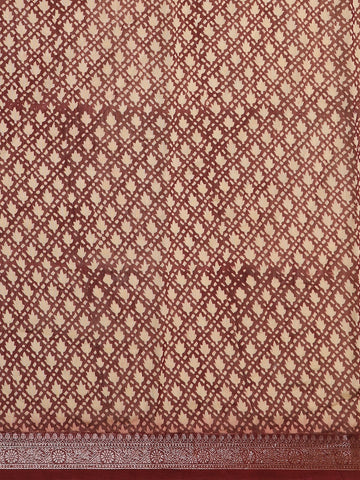 The saree is beautifully framed with a maroon zari woven border, adding a classic touch of traditional finesse. The contrast maroon pallu enhances the appeal, providing a visually rich finish to the drape. Paired with a matching contrast maroon blouse, this saree reflects refined taste and timeless style.