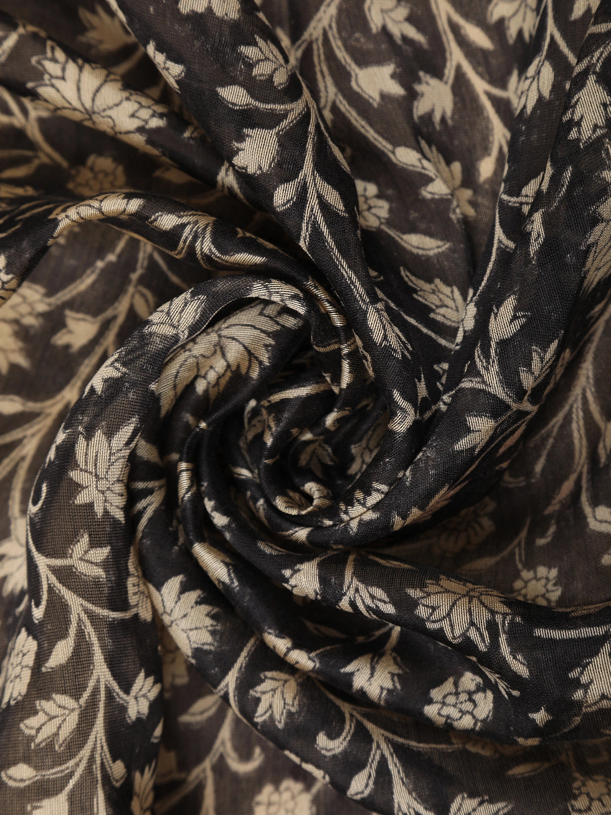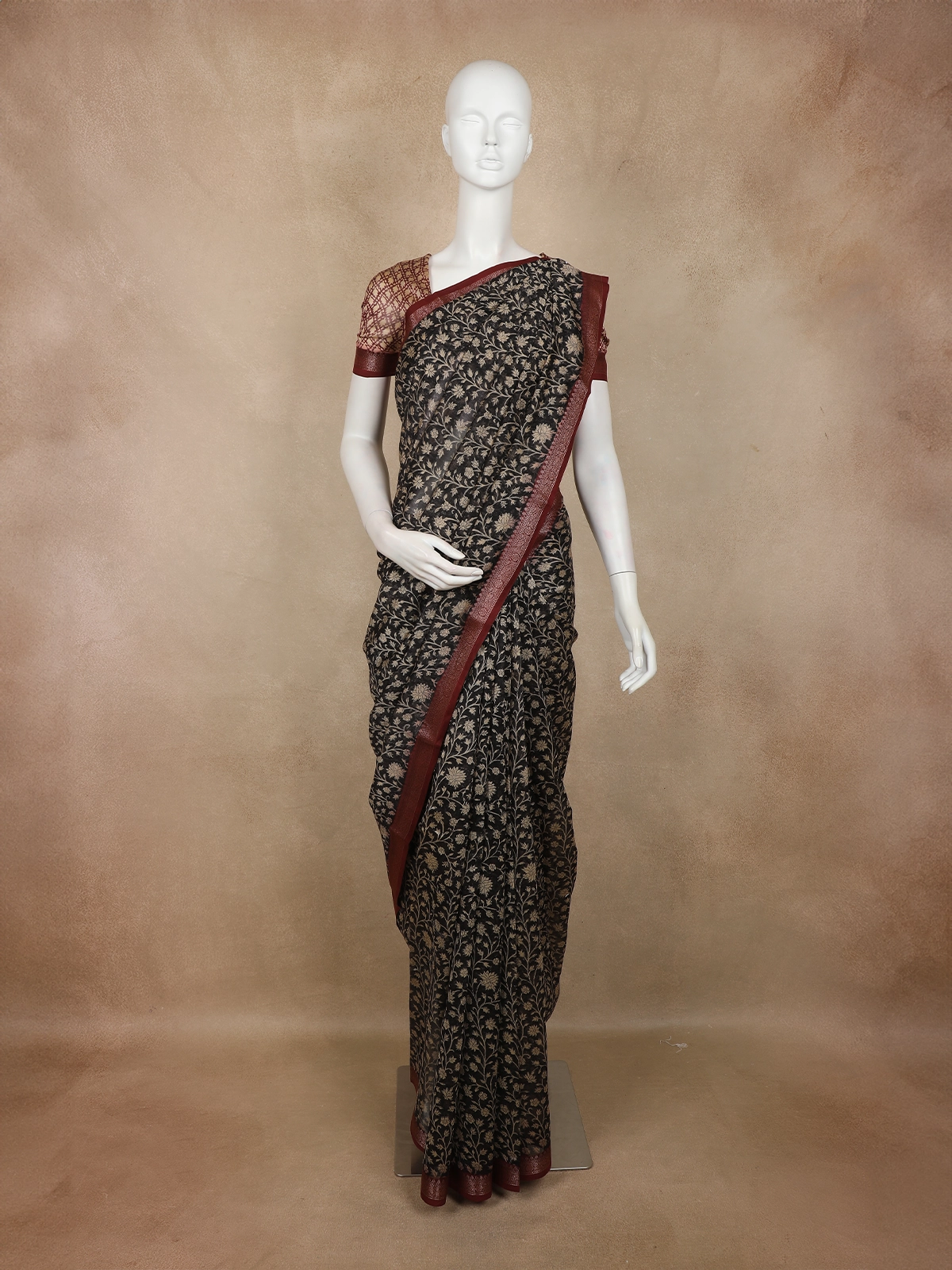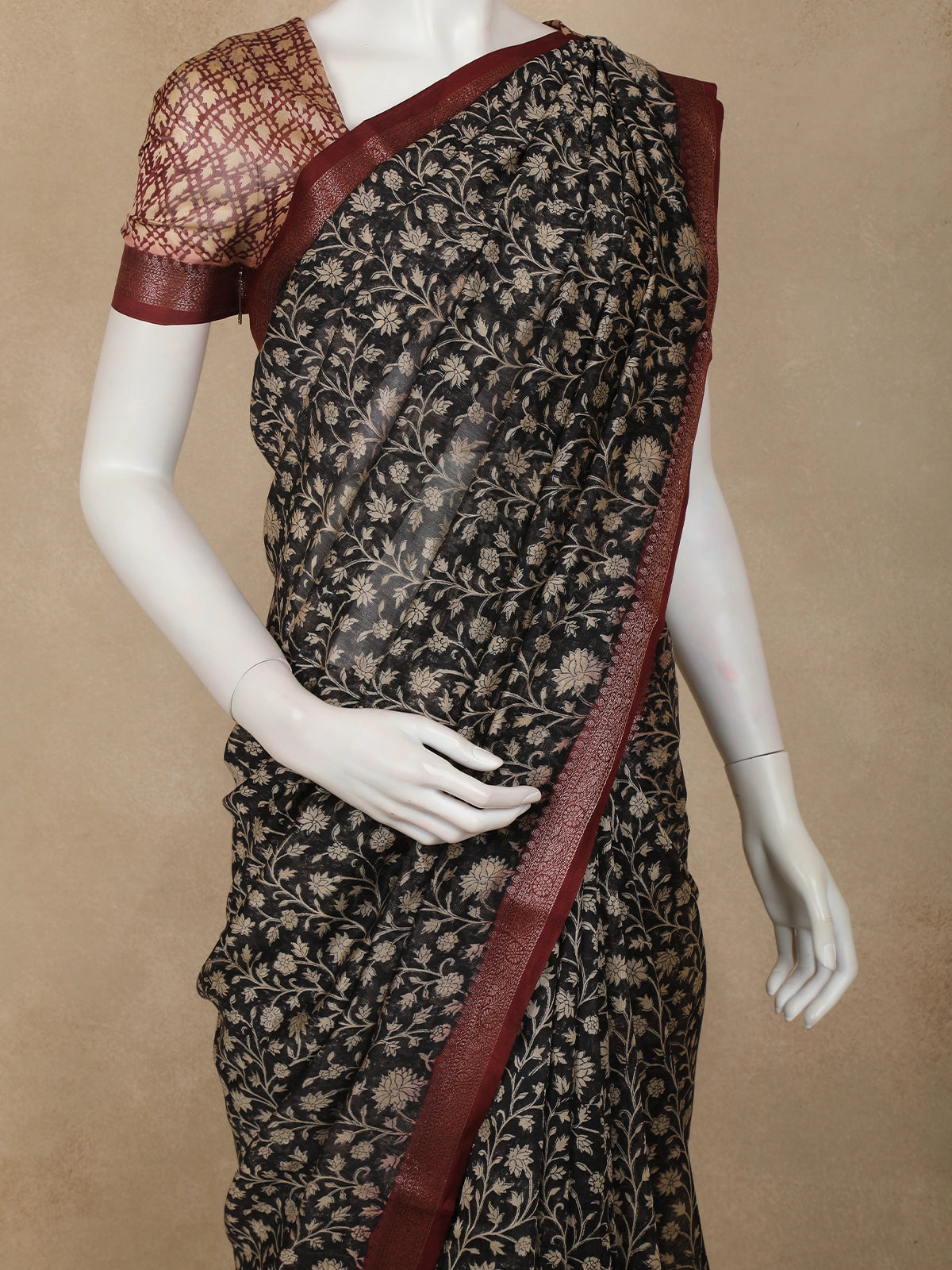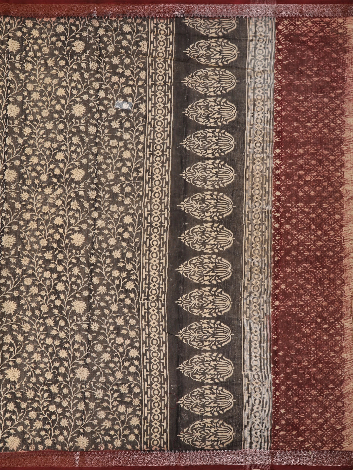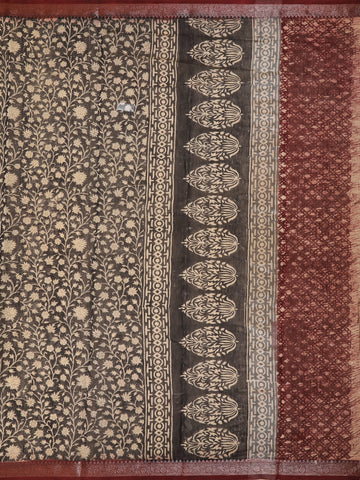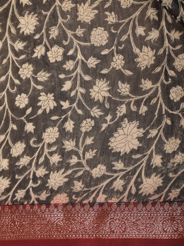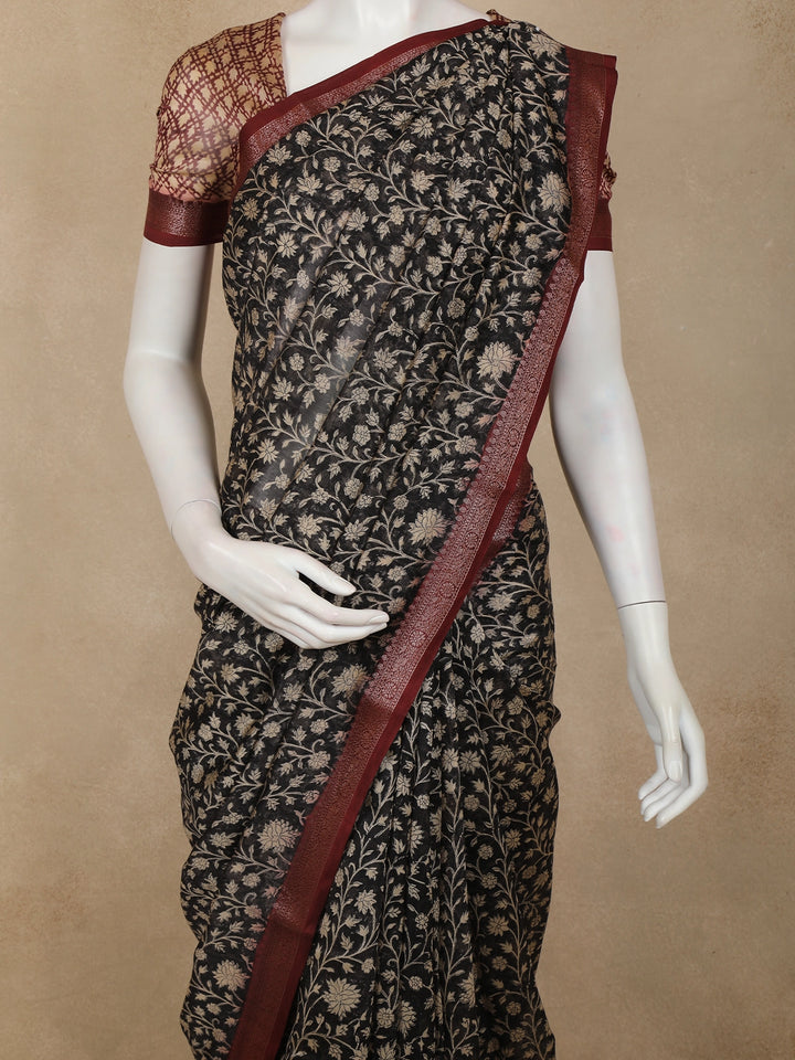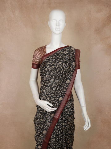 Black Floral Printed Chandheri Cotton Saree with Maroon Zari Border